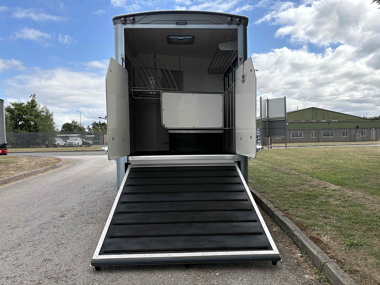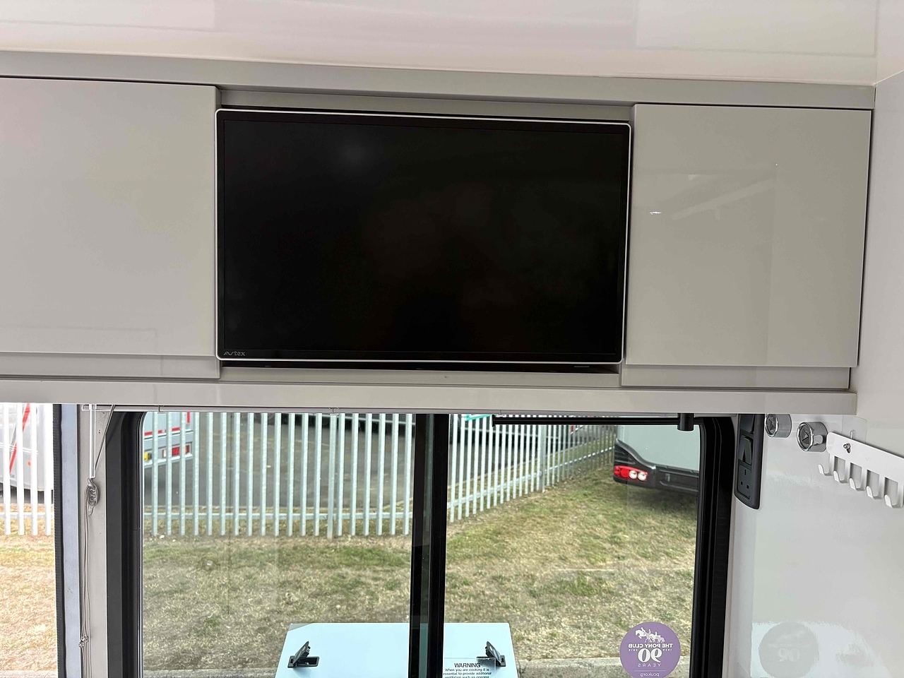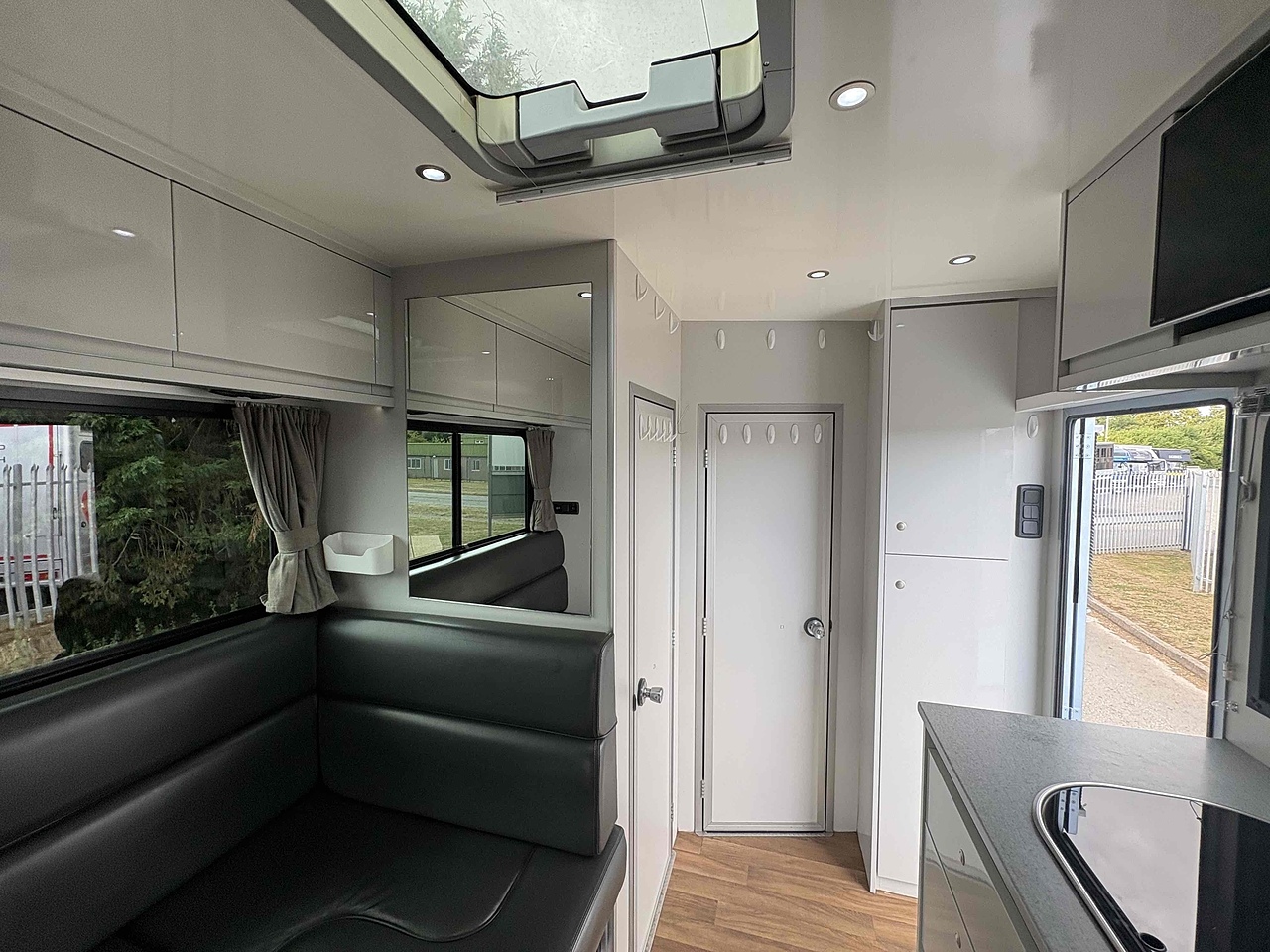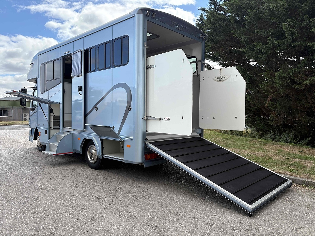 STALLED FOR 2 HORSES/ 3 PONIES, 10MM THICK ONE PIECE RUBBER MAT, ALUMINIUM INTERLOCKING FLOORING SYSTEM WITH ALL ALUMINIUM WASTE TROUGHS TO THE PERIMETER. 2 STAINLESS STEEL GAS SPRUNG PARTITIONS, STAINLESS STEEL HIGH LEVEL RUG RACK, HORSE AREA CAMERA, STAINLESS STEEL WINDOW GRILLS, SPRING BALANCED MANUALLY OPERATED RAMP, DAY AND NIGHT TIME TRAVELLING LIGHTS, REAR LOADING LIGHT, POP UP GLASS ROOF VENT. GRP WALK UP GATES.