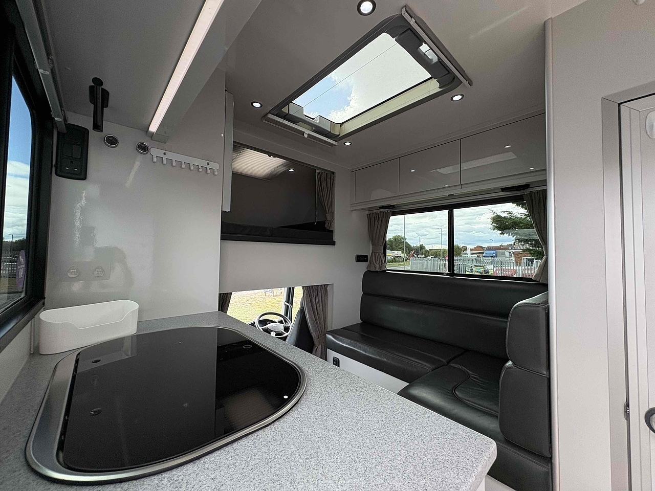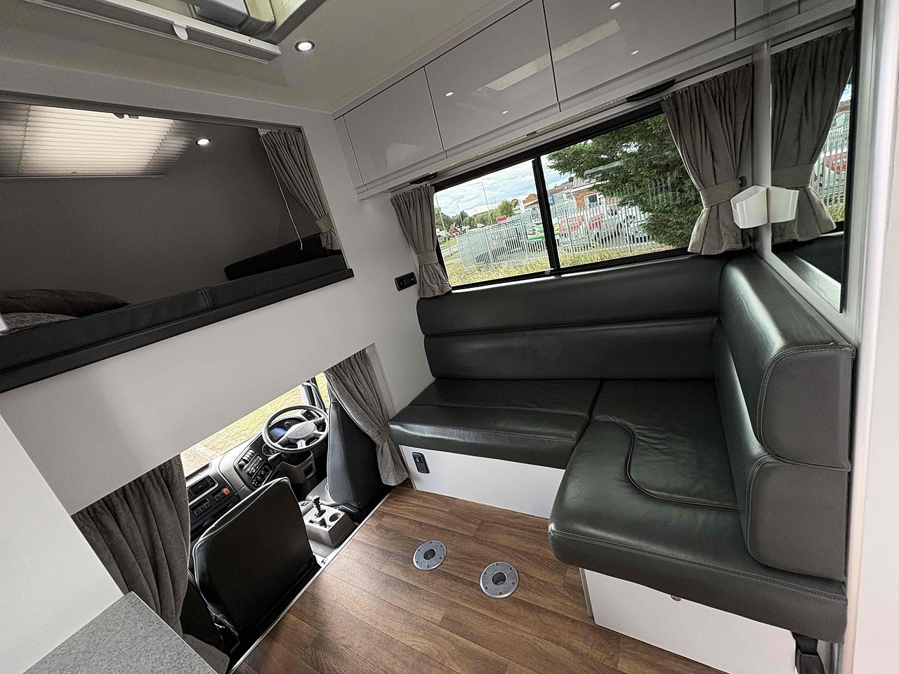 LUXURY LIVING AREA SLEEPING 4, DOUBLE BED IN LUTON, POP UP GLASS ROOF VENT WITH BLIND , DOWNLIGHTERS AND USB CHARGING POINT. "L" SHAPED SOFA WITH PULL DOWN BED UPHOLSTERED CHARCOAL GREY LEATHER MATCHING THE CAB, REMOVEABLE TABLE, LARGE WARDROBE WITH WAECO FRIDGE ABOVE, SOFT CLOSE HIGH LEVEL STORAGE UNITS IN GLOSS PALE GREY WITH PALE GREY WALLS, SMEV TRIPLE GAS HOB WITH INTERGRAL HOT/COLD WATER BASIN. MICROWAVE, 240V HOOK UP AND MULTIPLE 3 PIN SOCKETS, TV/DVD PLAYER, INTEGRATED CAB/LIVING SOUND SYSTEM. LARGE GLASS POP UP VENT WITH BLIND , PRIVACY GLASS WITH MATCHING CURTAINS/BLINDS. MOOD LIGHTING, HIGH LEVEL LIGHTING, TRUMA GAS BLOWN AIR HEATING AND HOT WATER SYSTEM. DISCRETE SECURITY BOX. CARNDEAN FLOORING.