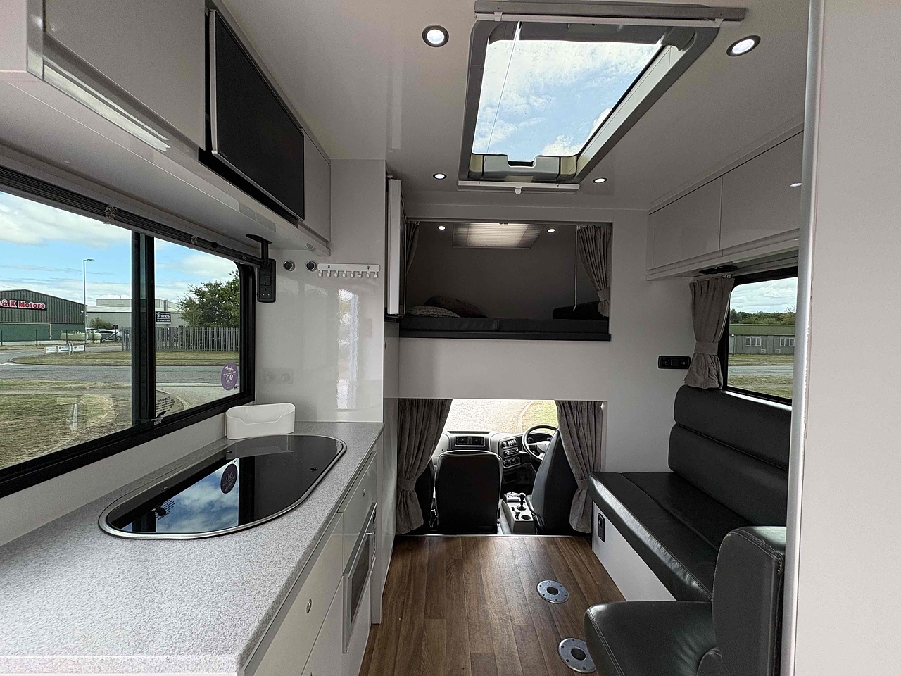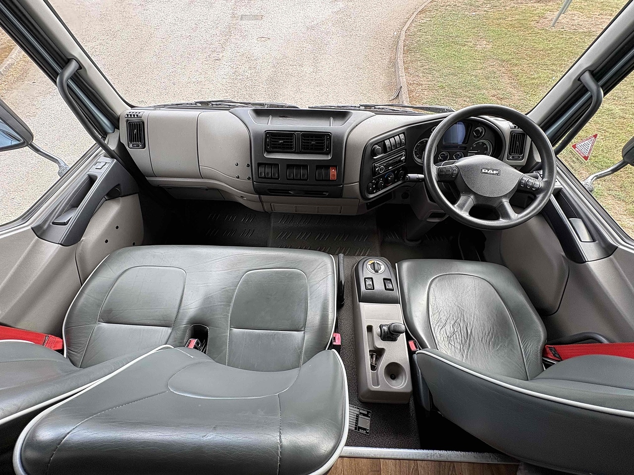THREE SEAT CAB, RETRIMMED IN CHARCOAL GREY LEATHER TO MATCH THE LIVING AREA, ELECTRIC WINDOWS, CRUISE CONTROL, SPEED LIMITER, BLUETOOTH CD PLAYER, REVERSING AND HORSE AREA CAMERA MONITOR, HEIGHT ADJUSTABLE STEERING WHEEL.