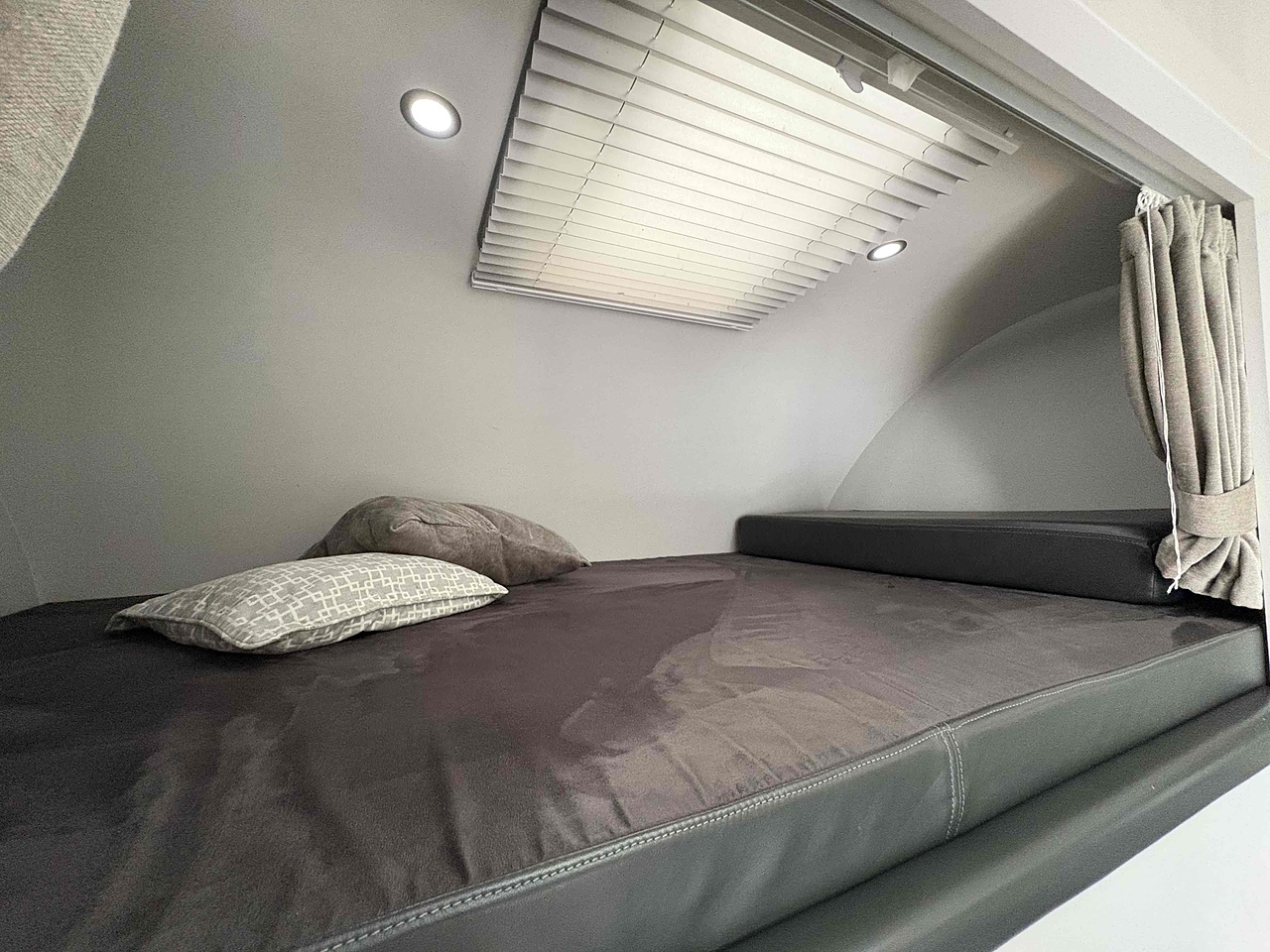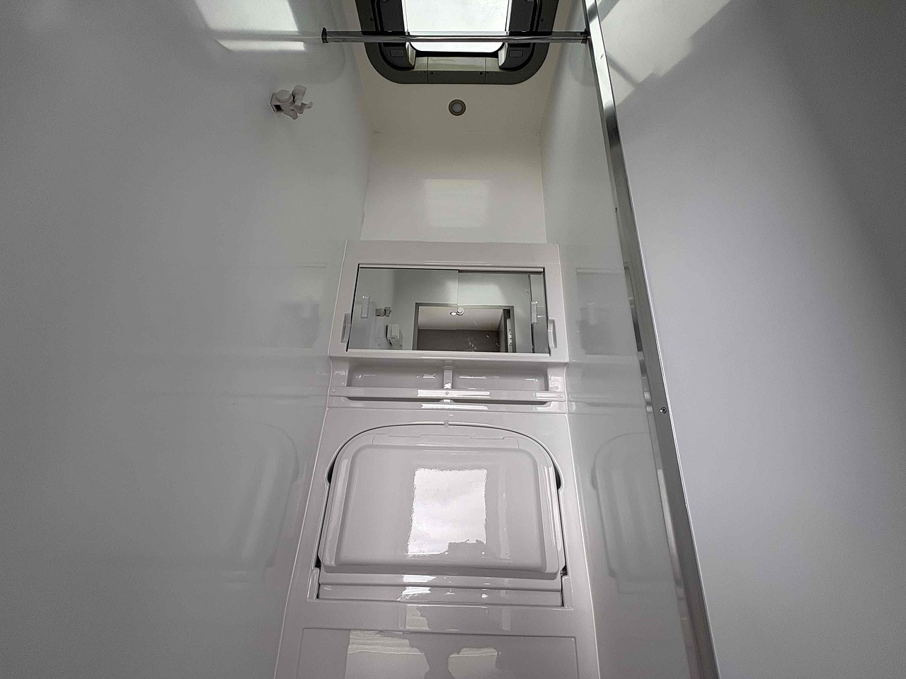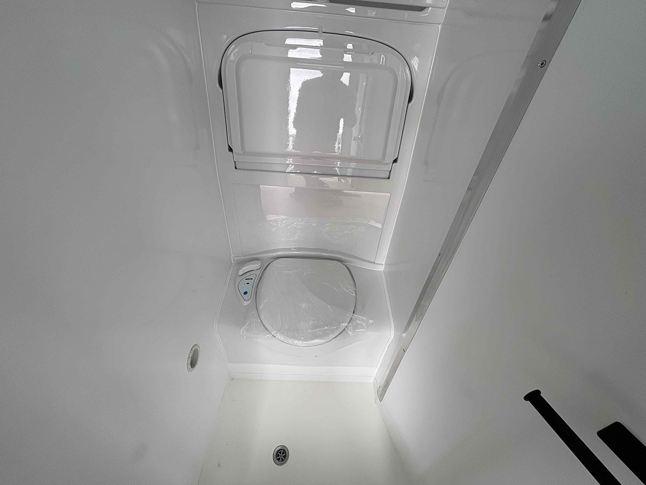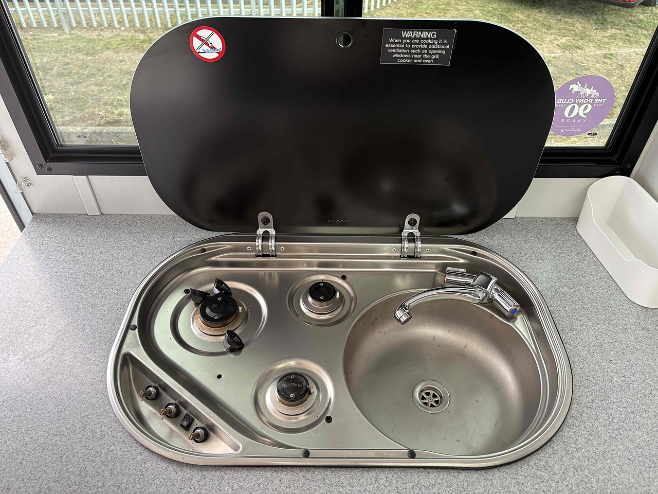 PULL DOWN BASIN WITH HOT AND COLD WATER, RETRACTABLE SHOWER HEAD. HIGH LEVEL VANITY UNIT WITH MIRROR, LARGE POP UP GLASS ROOF VENT, THETFORD CASSETTE TOILET, DOWN LIGHTERS.