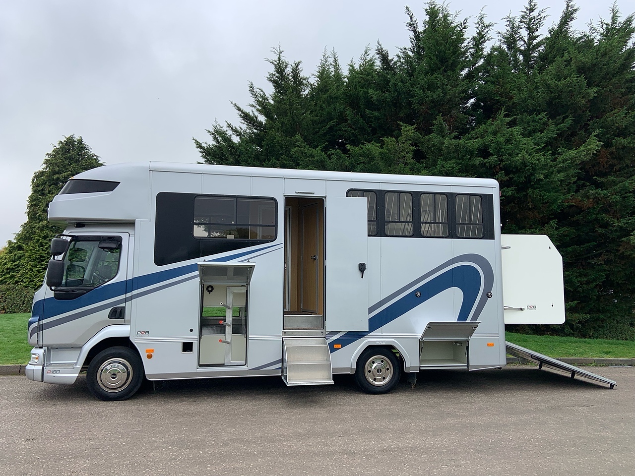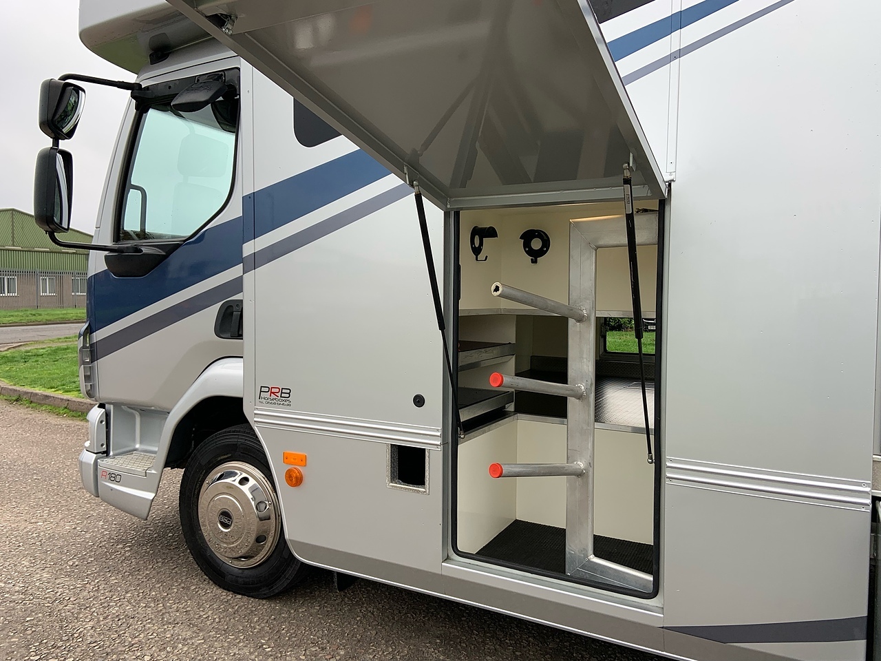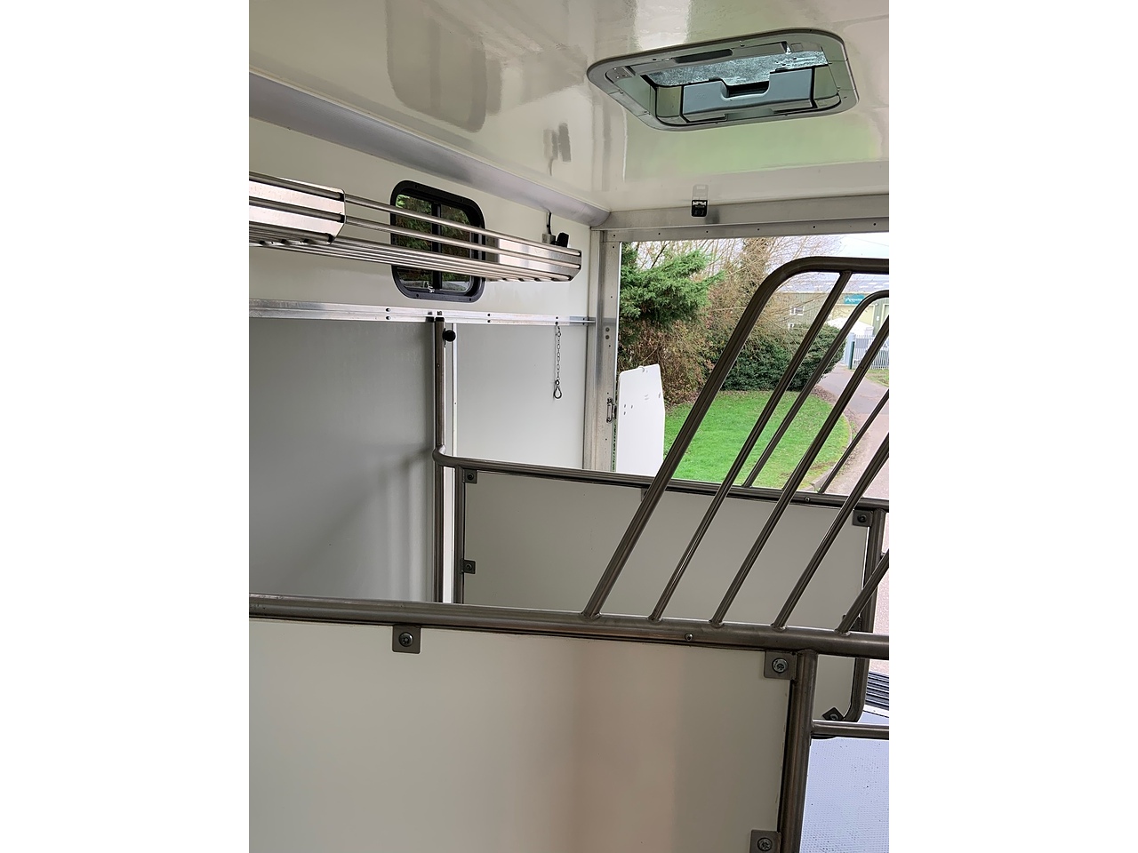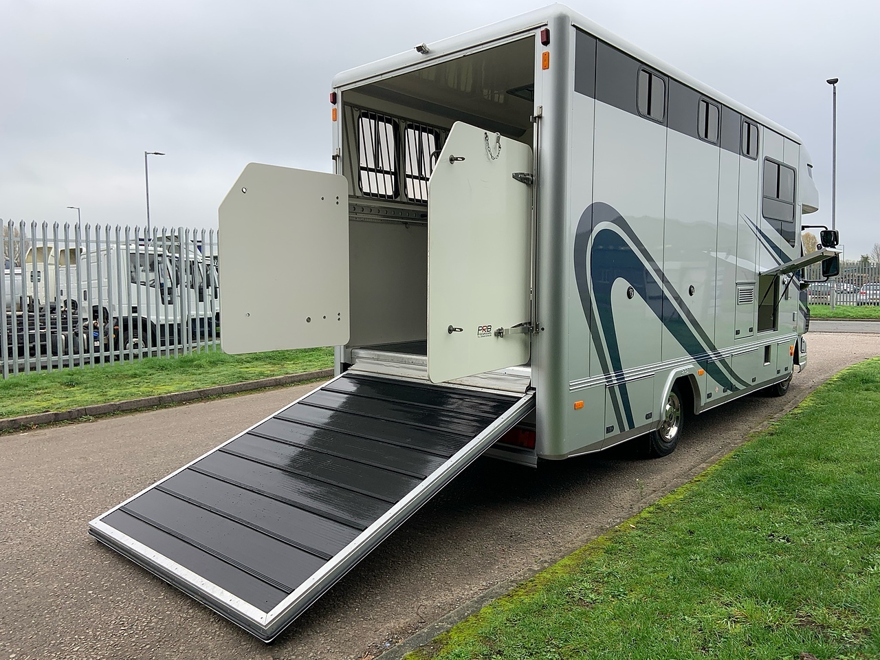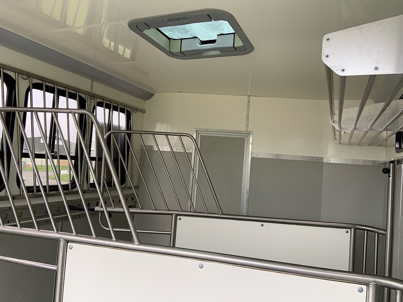 STALLED FOR 2 HORSES/ 3 PONIES, 10MM THICK ONE PIECE RUBBER MAT, ALUMINIUM INTERLOCKING FLOORING SYSTEM WITH ALL ALUMINIUM WASTE TROUGHS TO THE PERIMETER. 2 STAINLESS STEEL GAS SPRUNG PARTITIONS, STAINLESS STEEL HIGH LEVEL RUG RACK, HORSE AREA CAMERA, STAINLESS STEEL WINDOW GRILLS, SPRING BALANCED MANUALLY OPERATED RAMP, DAY AND NIGHT TIME TRAVELLING LIGHTS, REAR LOADING LIGHT, POP UP GLASS ROOF VENT. GRP WALK UP GATES.