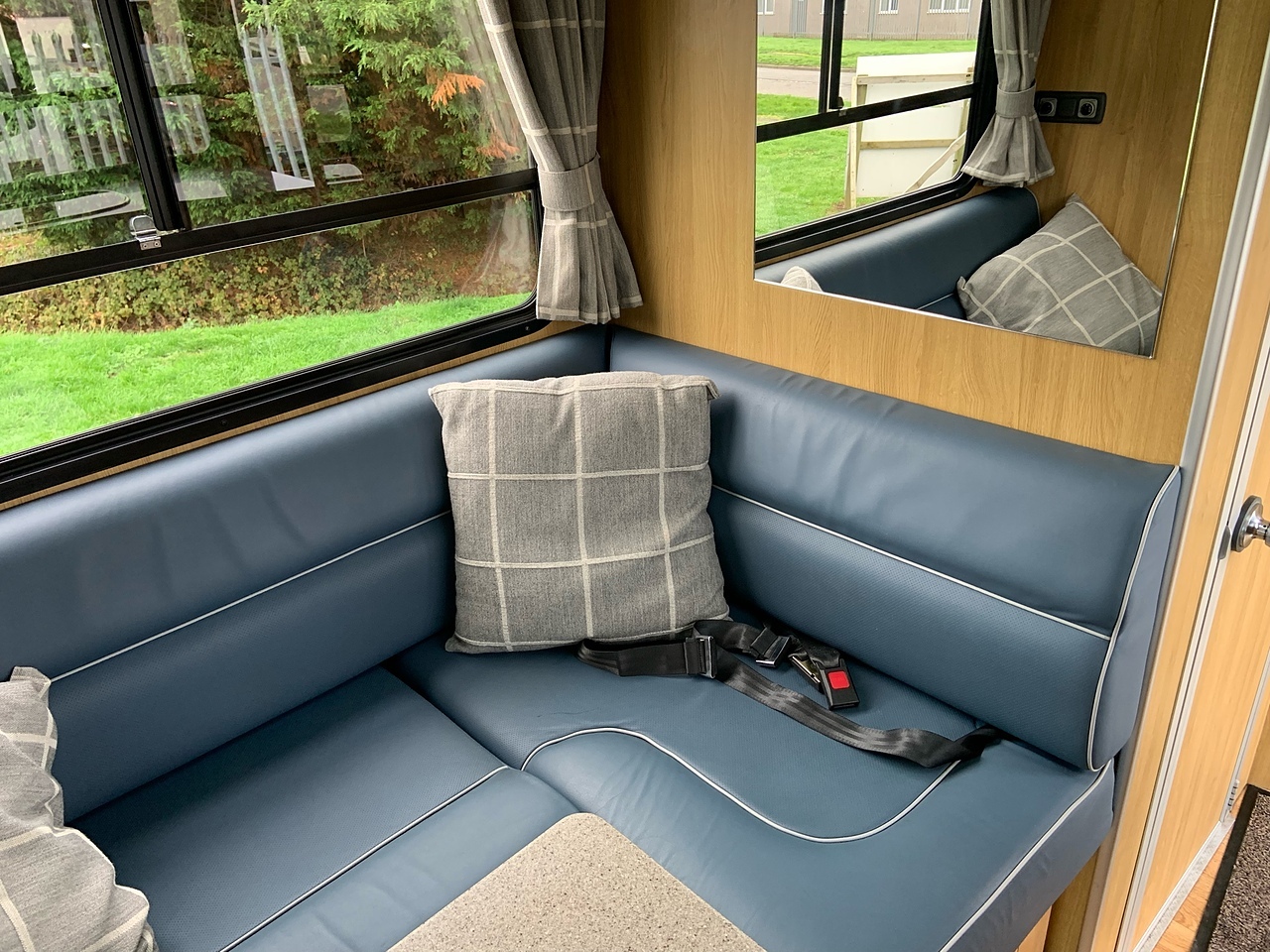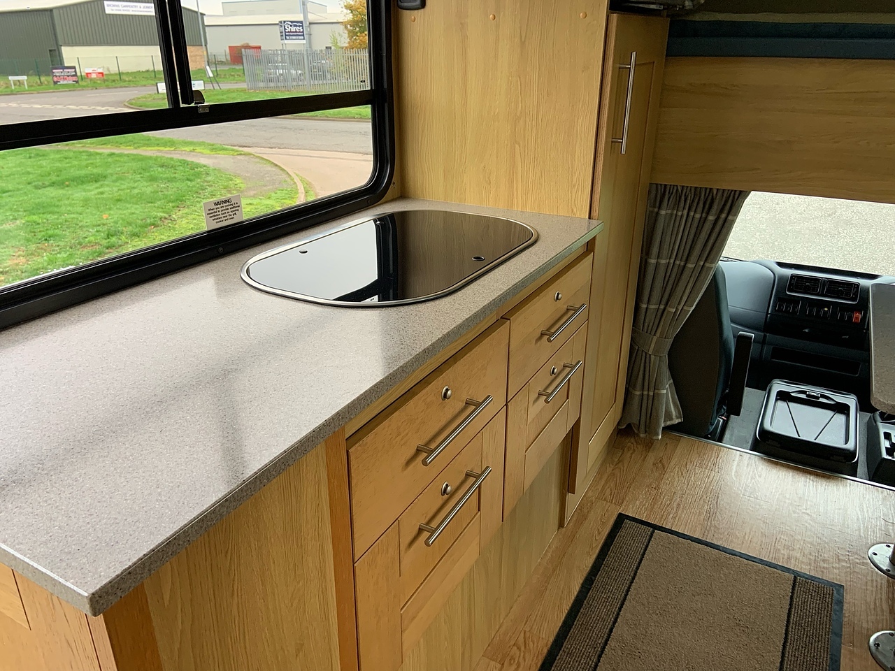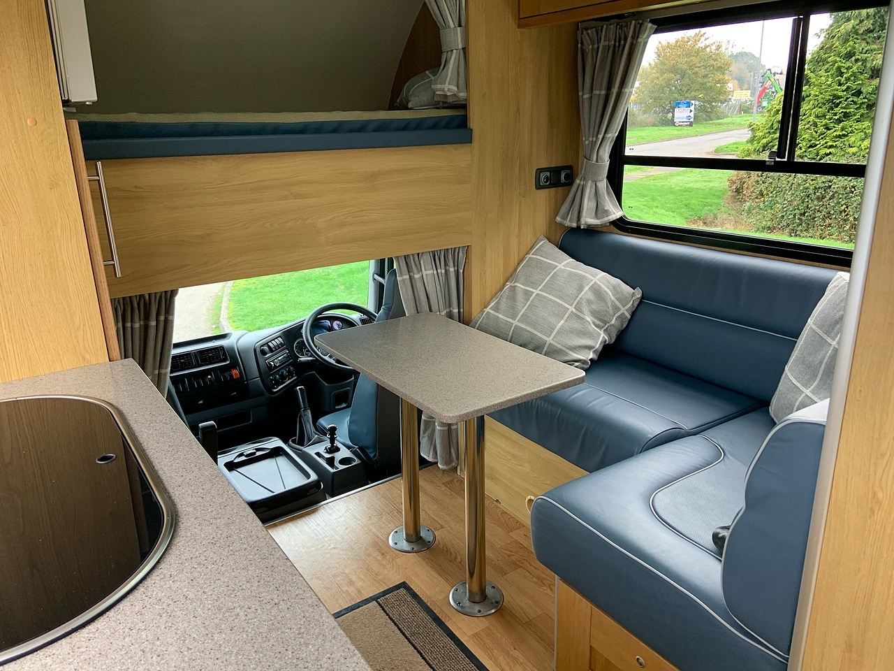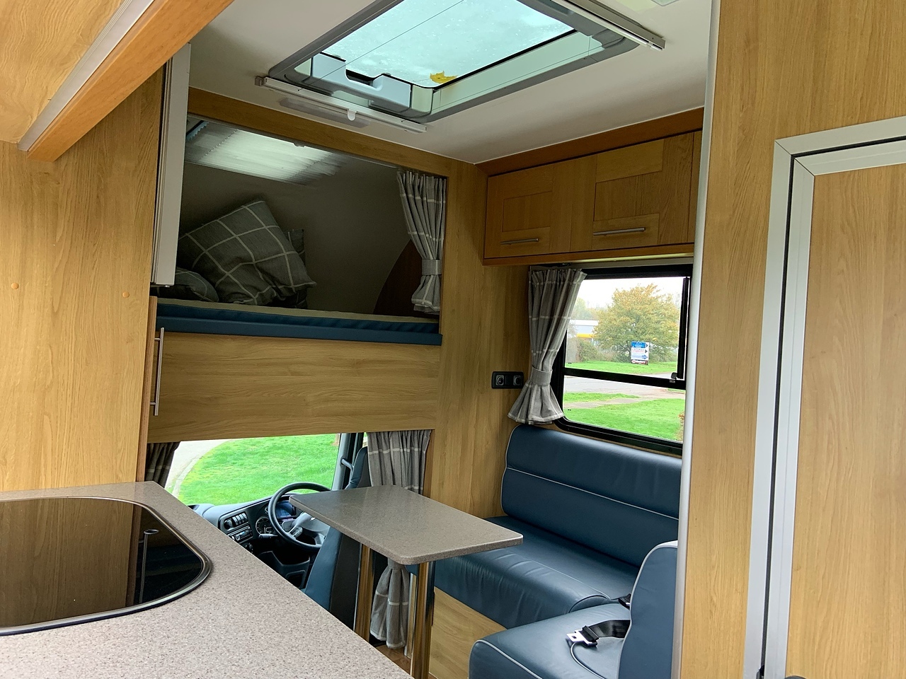 LUXURY LIVING AREA SLEEPING 4, DOUBLE BED IN LUTON, POP UP GLASS ROOF VENT WITH BLIND , DOWNLIGHTERS AND USB CHARGING POINT. "L" SHAPED SOFA WITH PULL DOWN BED UPHOLSTERED CHARCOAL GREY LEATHER MATCHING THE CAB, REMOVEABLE TABLE, LARGE WARDROBE WITH WAECO FRIDGE ABOVE, SOFT CLOSE HIGH LEVEL STORAGE UNITS IN GLOSS PALE GREY WITH PALE GREY WALLS, SMEV TRIPLE GAS HOB WITH INTERGRAL HOT/COLD WATER BASIN. MICROWAVE, 240V HOOK UP AND MULTIPLE 3 PIN SOCKETS, TV/DVD PLAYER, INTEGRATED CAB/LIVING SOUND SYSTEM. LARGE GLASS POP UP VENT WITH BLIND , PRIVACY GLASS WITH MATCHING CURTAINS/BLINDS. MOOD LIGHTING, HIGH LEVEL LIGHTING, TRUMA GAS BLOWN AIR HEATING AND HOT WATER SYSTEM. DISCRETE SECURITY BOX. CARNDEAN FLOORING.