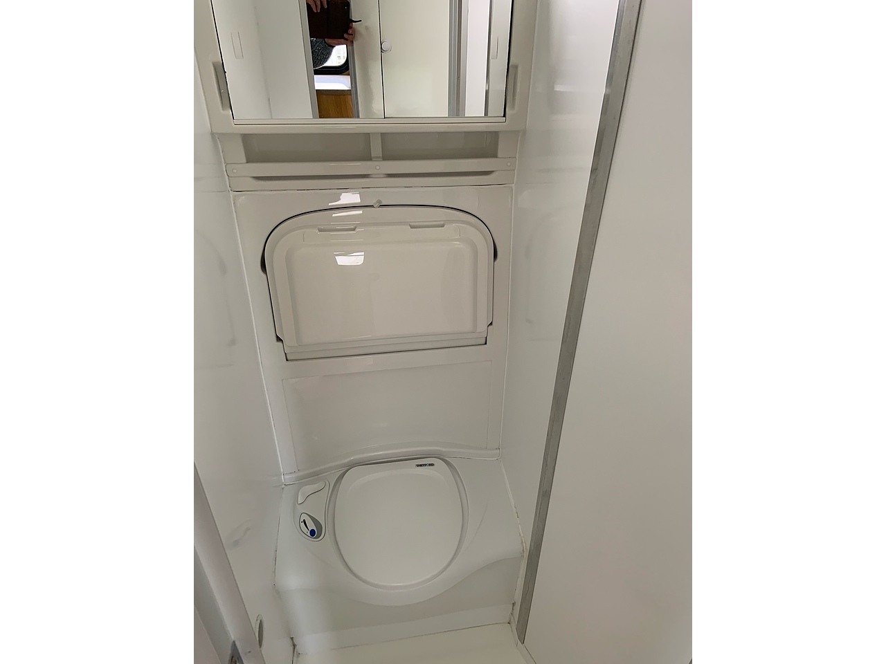 PULL DOWN BASIN WITH HOT AND COLD WATER, RETRACTABLE SHOWER HEAD. HIGH LEVEL VANITY UNIT WITH MIRROR, LARGE POP UP GLASS ROOF VENT, THETFORD CASSETTE TOILET, DOWN LIGHTERS.