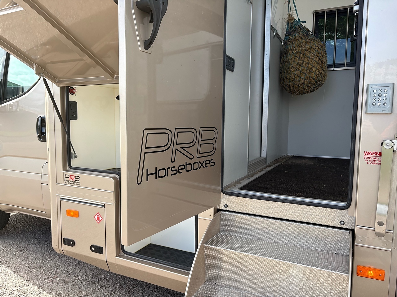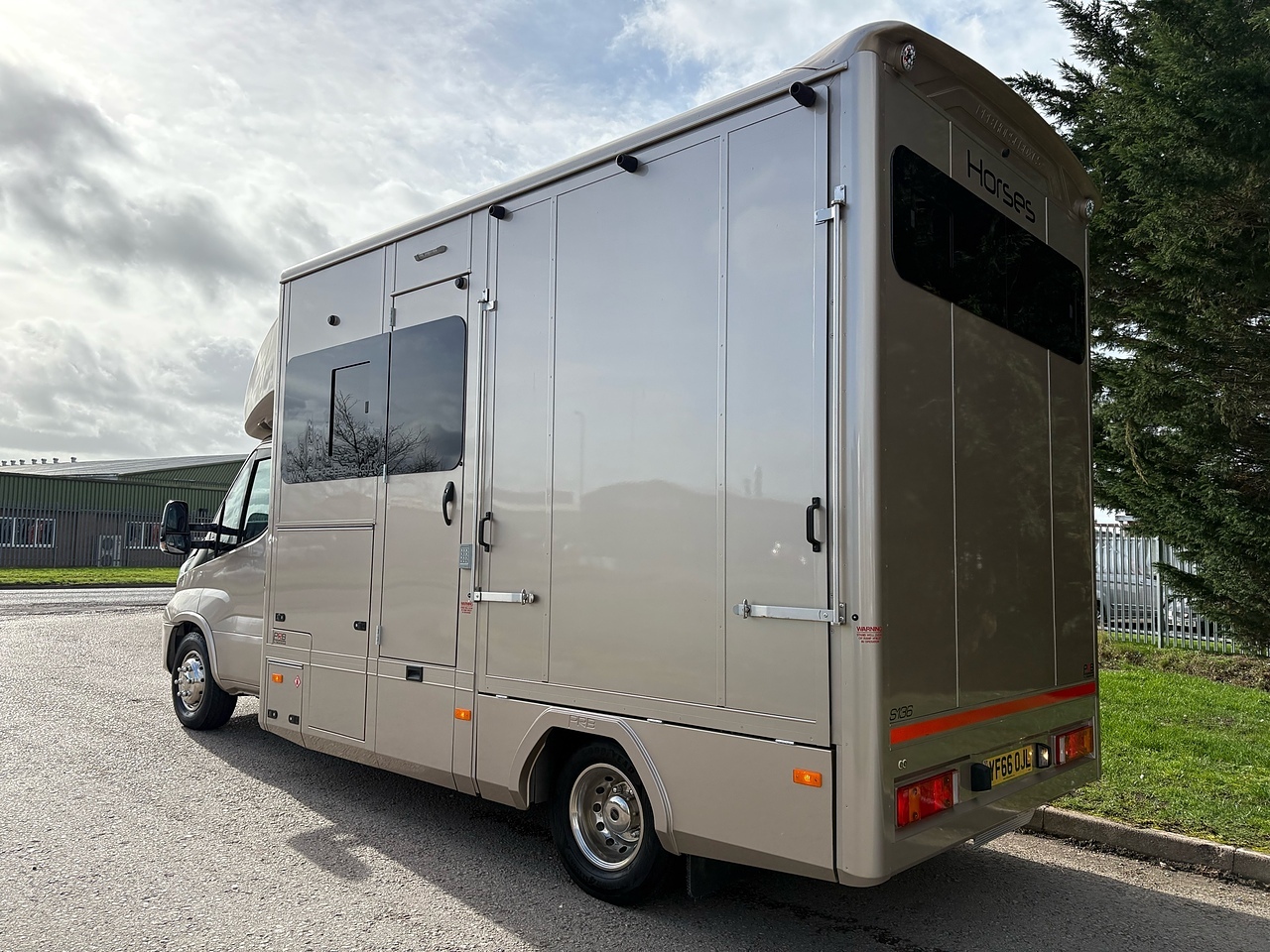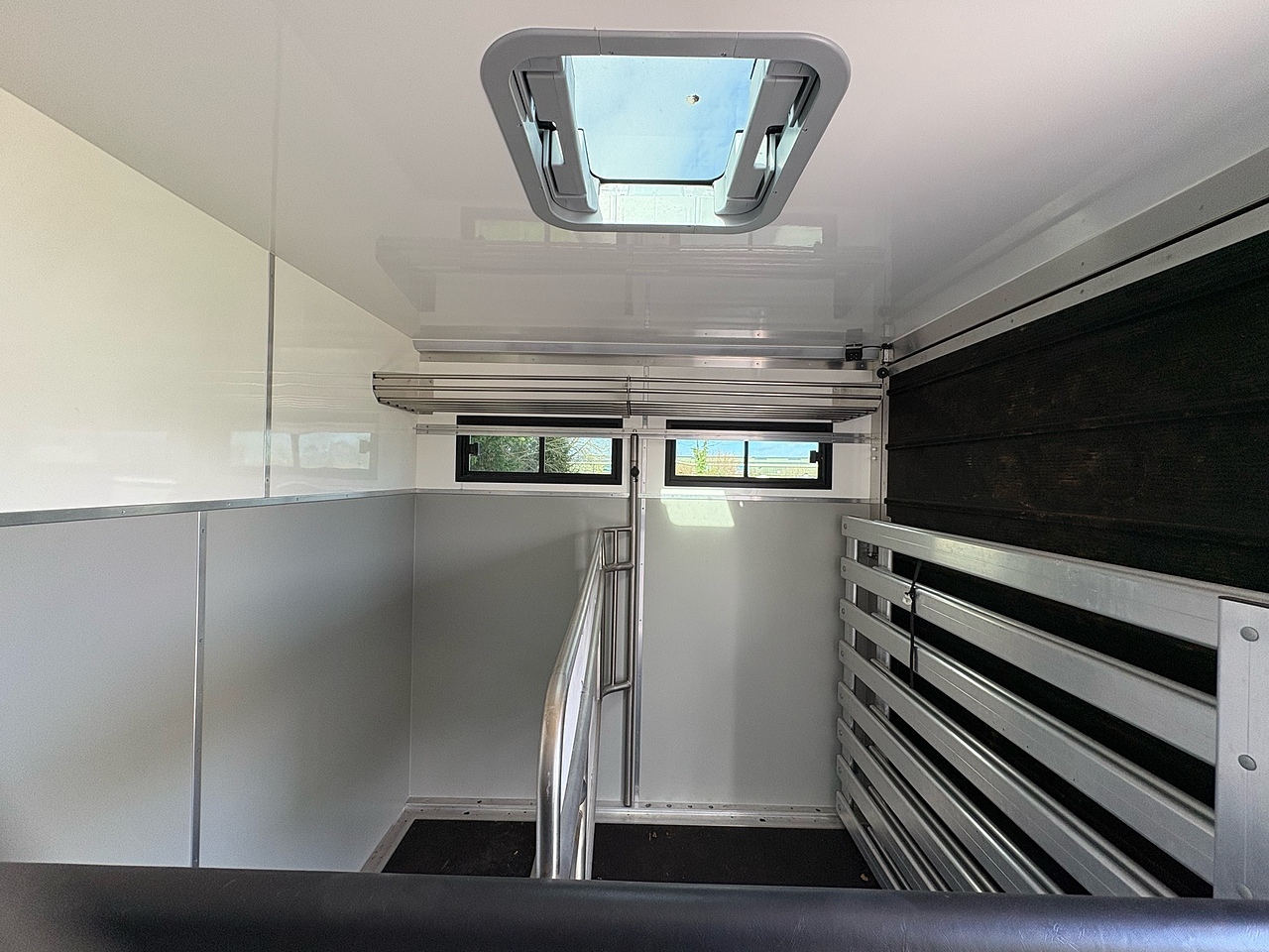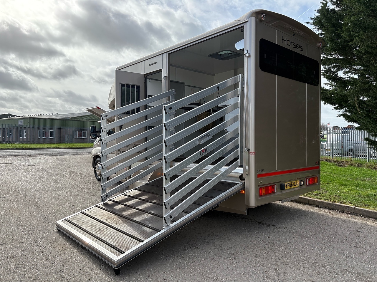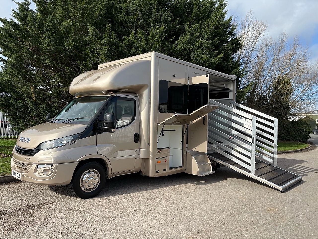 STALLED FOR 2 LARGE HORSES FORWARD FACING, 10MM THICK ONE PIECE RUBBER MAT, ALUMINIUM INTERLOCKING FLOORING SYSTEM WITH ALL ALUMINIUM WASTE TROUGHS TO THE PERIMETER. 1 X STAINLESS STEEL PARTITION, STAINLESS STEEL HIGH LEVEL RUG RACK, HORSE AREA CAMERA, STAINLESS STEEL WINDOW GRILLS, ELECTRO HYDRAULIC OPERATED SIDE RAMP, DAY AND NIGHT TIME TRAVELLING LIGHTS, REAR LOADING LIGHT. ALUMINIUM EURO STYLE WALK UP GATES, POP UP GLASS ROOF VENT.