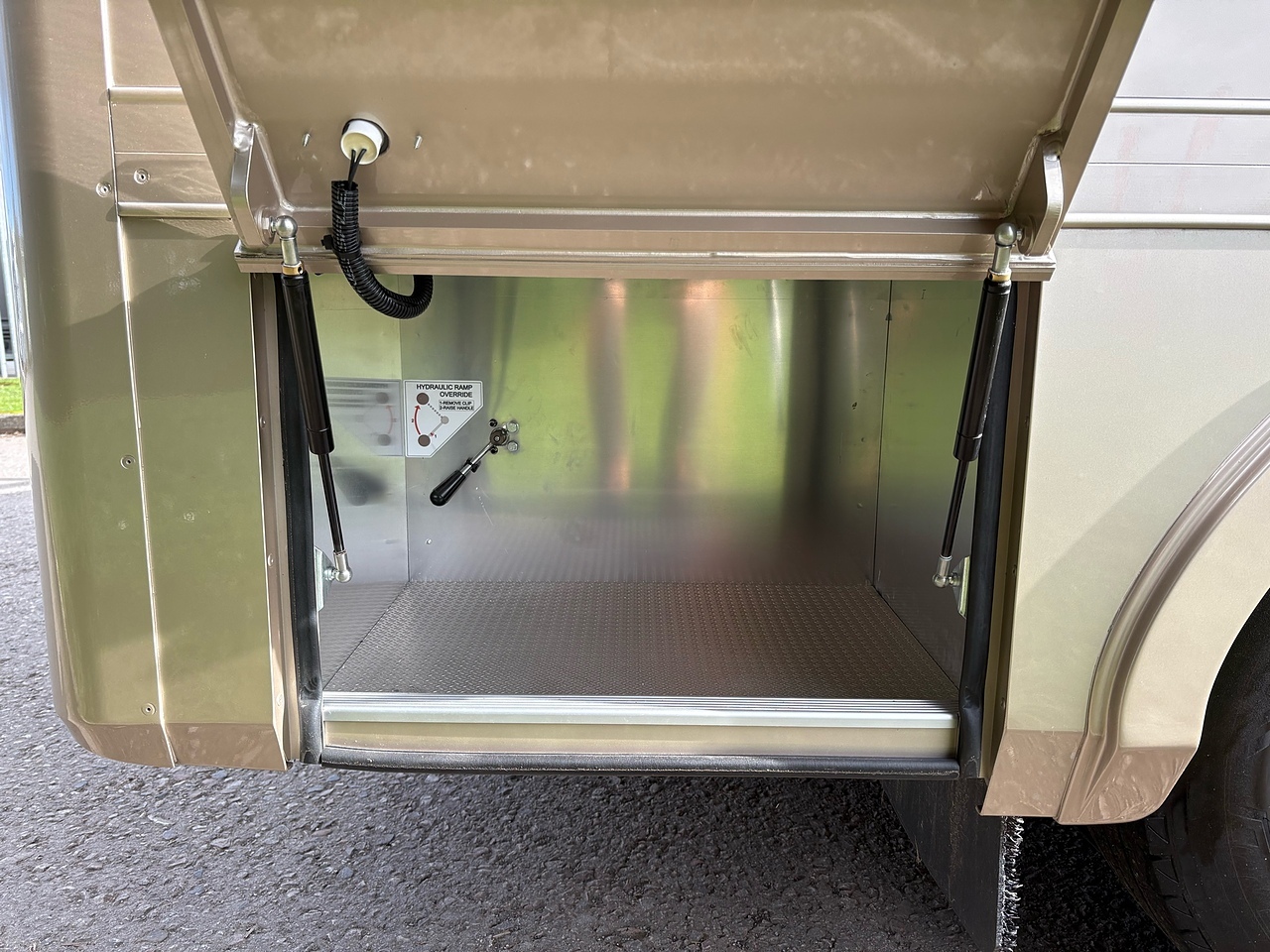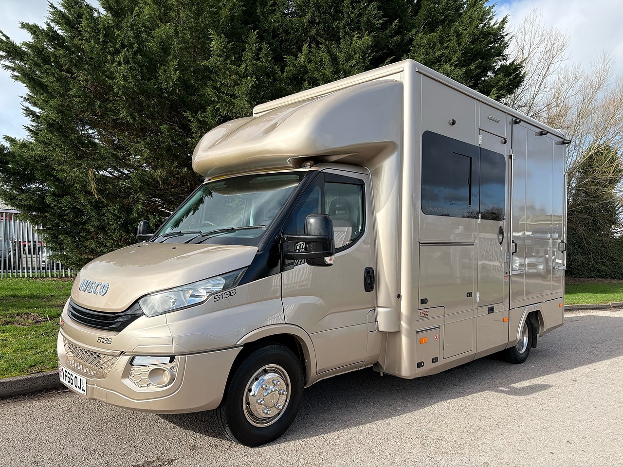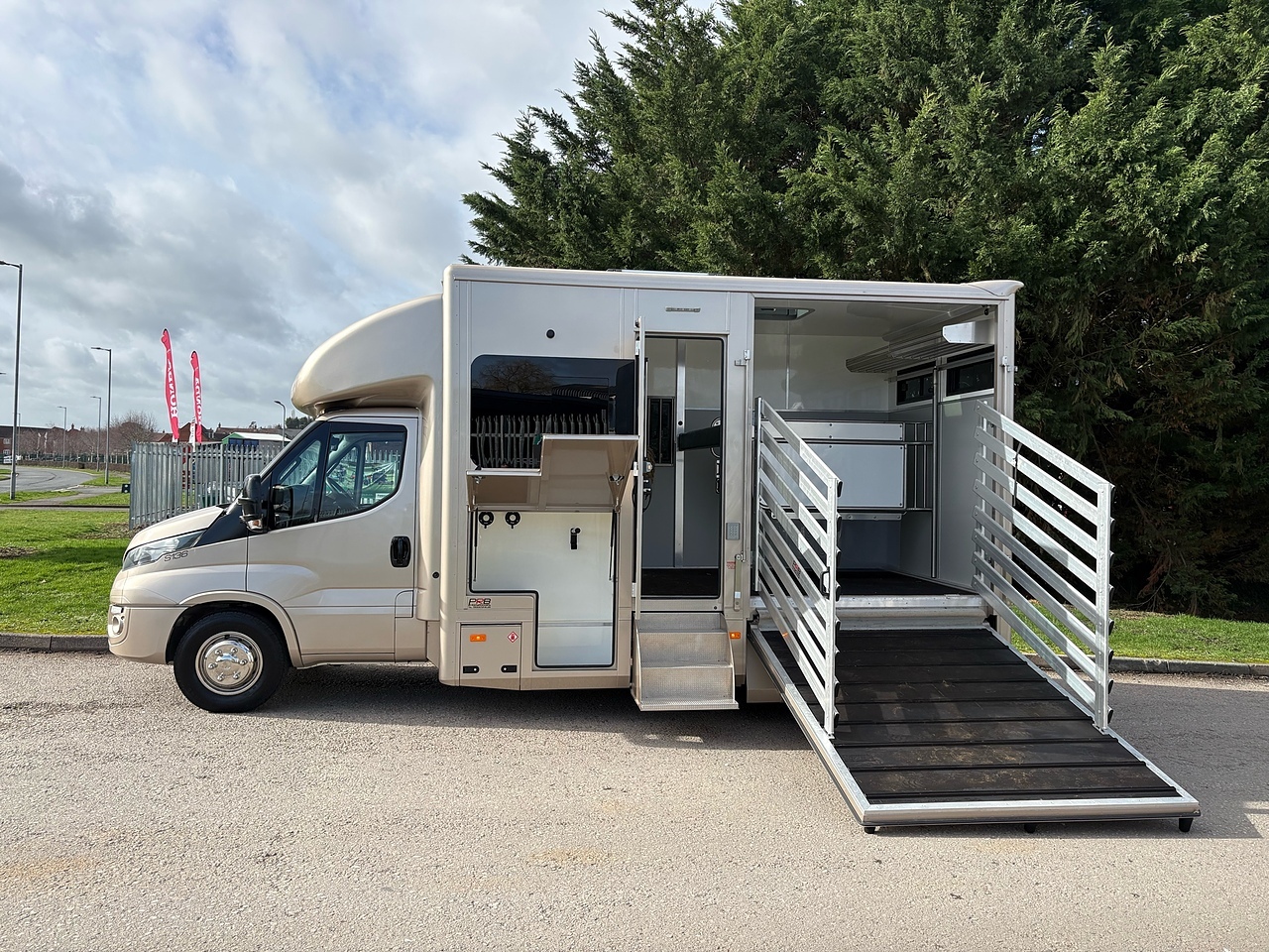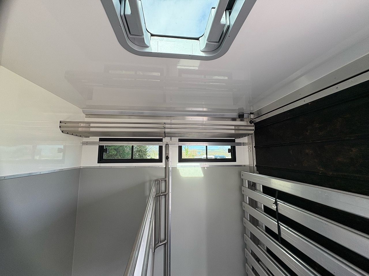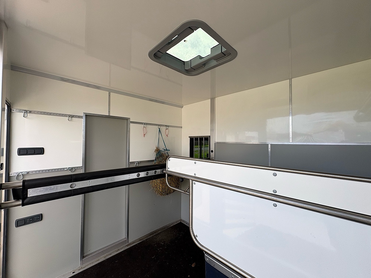 STALLED FOR 2 LARGE HORSES FORWARD FACING, 10MM THICK ONE PIECE RUBBER MAT, ALUMINIUM INTERLOCKING FLOORING SYSTEM WITH ALL ALUMINIUM WASTE TROUGHS TO THE PERIMETER. 1 X STAINLESS STEEL PARTITION, STAINLESS STEEL HIGH LEVEL RUG RACK, HORSE AREA CAMERA, STAINLESS STEEL WINDOW GRILLS, ELECTRO HYDRAULIC OPERATED SIDE RAMP, DAY AND NIGHT TIME TRAVELLING LIGHTS, REAR LOADING LIGHT. ALUMINIUM EURO STYLE WALK UP GATES, POP UP GLASS ROOF VENT.