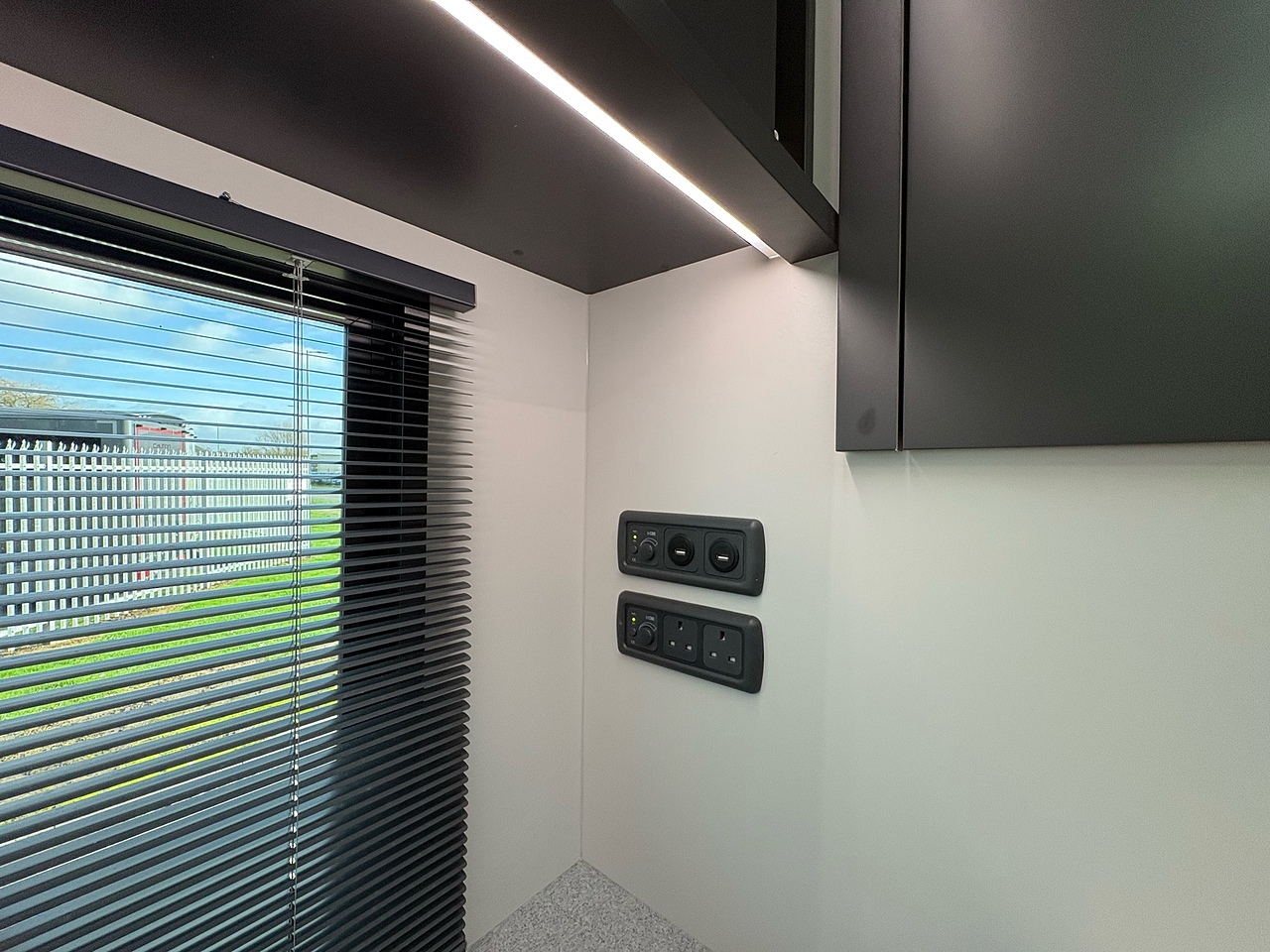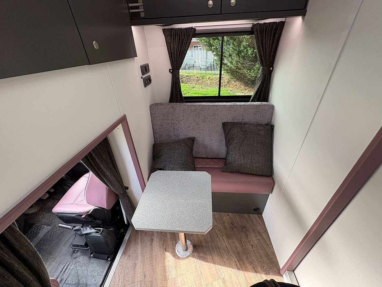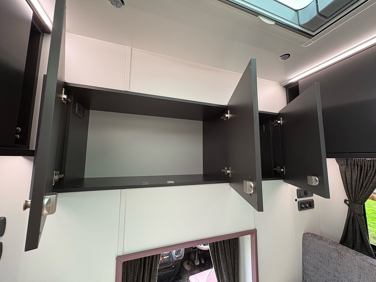 STORAGE AREA IN LUTON, POP UP GLASS ROOF VENT WITH BLACK OUT BLIND AND FLY SCREEN, DOWNLIGHTERS AND USB CHARGING POINT. 2 SEAT SOFA COVERED IN VELE WATLING BENTLY QUILTED LEATHER, REMOVEABLE TABLE, WAECO 80L UNDER COUNTER FRIDGE, SOFT CLOSE HIGH LEVEL STORAGE UNITS IN GLOSS WHITE, DOUBLE GAS HOB WITH INTERGRAL HOT/COLD WATER BASIN, 240V HOOK UP AND MULTIPLE 3 PIN SOCKETS, INTEGRATED CAB/LIVING SOUND SYSTEM. LARGE GLASS POP UP VENT WITH BLACKOUT BLIND AND FLYSCREEN, PRIVACY GLASS WITH MATCHING CURTAINS/BLINDS. MOOD LIGHTING, HIGH LEVEL LIGHTING, GAS BLOWN AIR HEATING AND HOT WATER SYSTEM. CARNDEAN FLOORING, ROOF MOUNTED SOLAR PANEL.