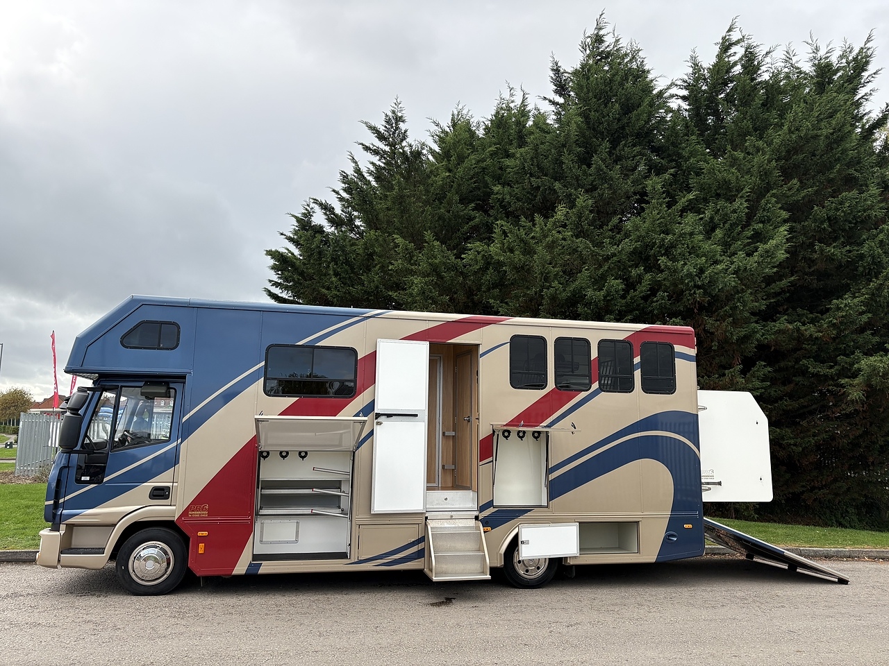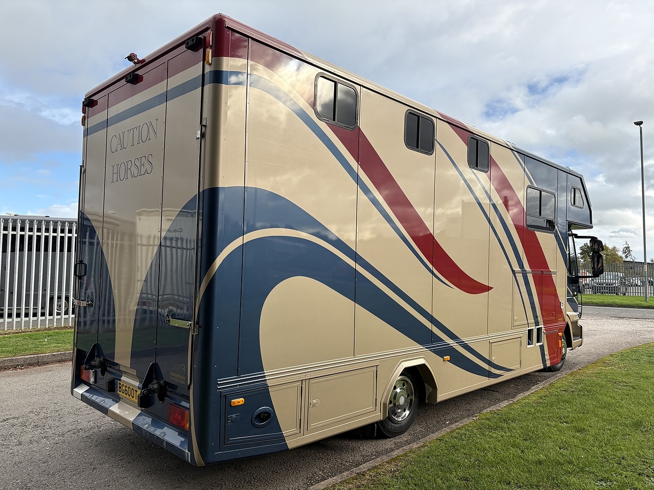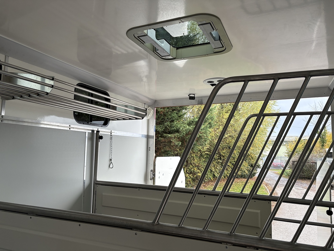 STALLED FOR 2 HORSES/ 3 PONIES, 10MM THICK ONE PIECE RUBBER MAT, ALUMINIUM INTERLOCKING FLOORING SYSTEM WITH ALL ALUMINIUM WASTE TROUGHS TO THE PERIMETER. 2 STAINLESS STEEL GAS SPRUNG PARTITIONS, STAINLESS STEEL HIGH LEVEL RUG RACK, HORSE AREA CAMERA, STAINLESS STEEL WINDOW GRILLS, SPRING BALANCED MANUALLY OPERATED RAMP, DAY AND NIGHT TIME TRAVELLING LIGHTS, REAR LOADING LIGHT, POP UP GLASS ROOF VENT. GRP WALK UP GATES.
