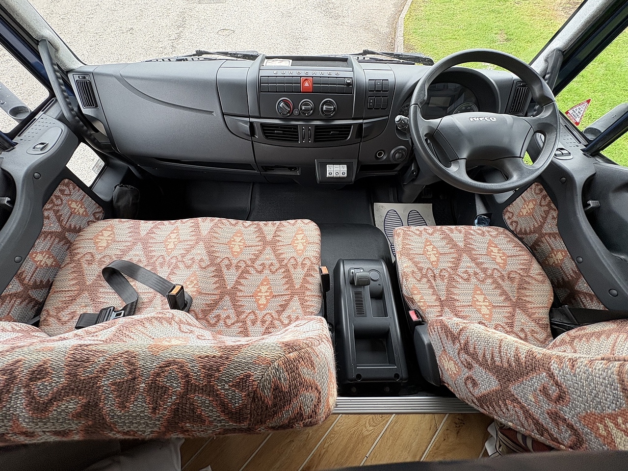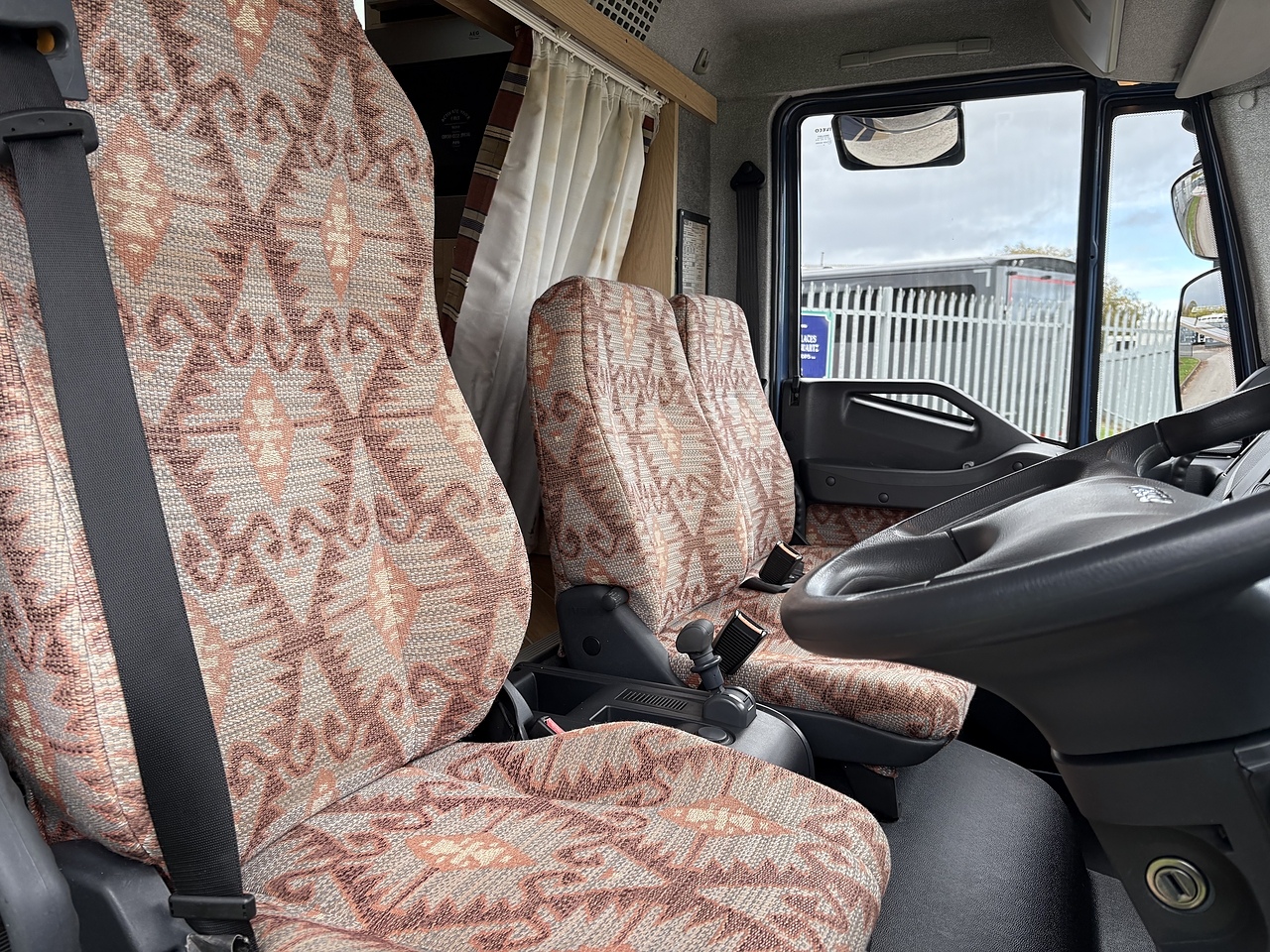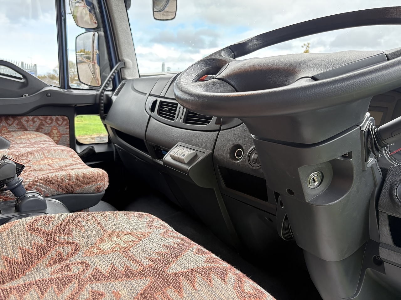 THREE SEAT CAB, RETRIMMED IN PATTERNED CLOTH TO MATCH THE LIVING AREA, ELECTRIC WINDOWS, CRUISE CONTROL, SPEED LIMITER, BLUETOOTH CD PLAYER, REVERSING AND HORSE AREA CAMERA MONITOR, HEIGHT ADJUSTABLE STEERING WHEEL.