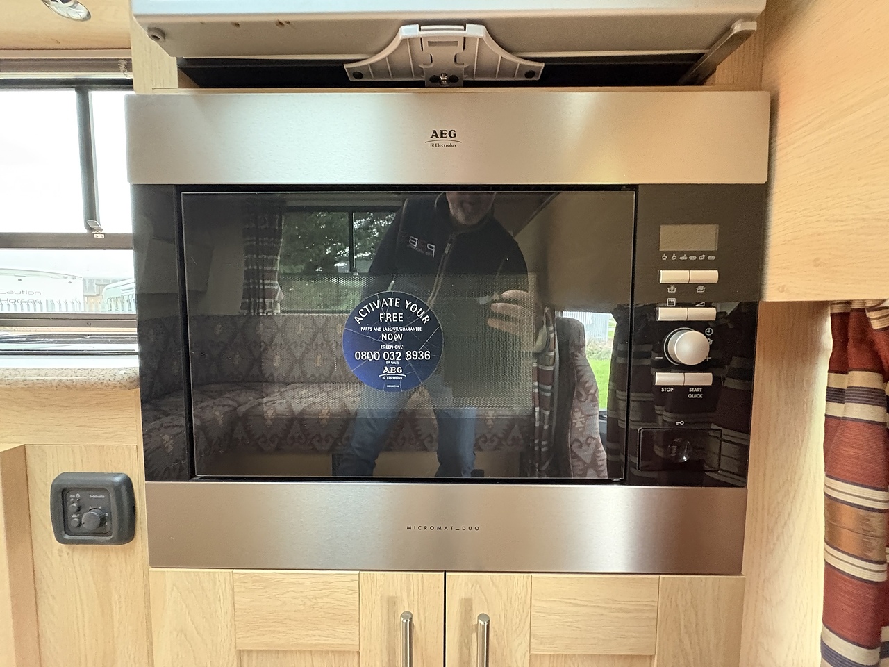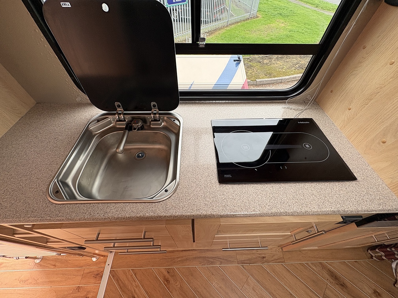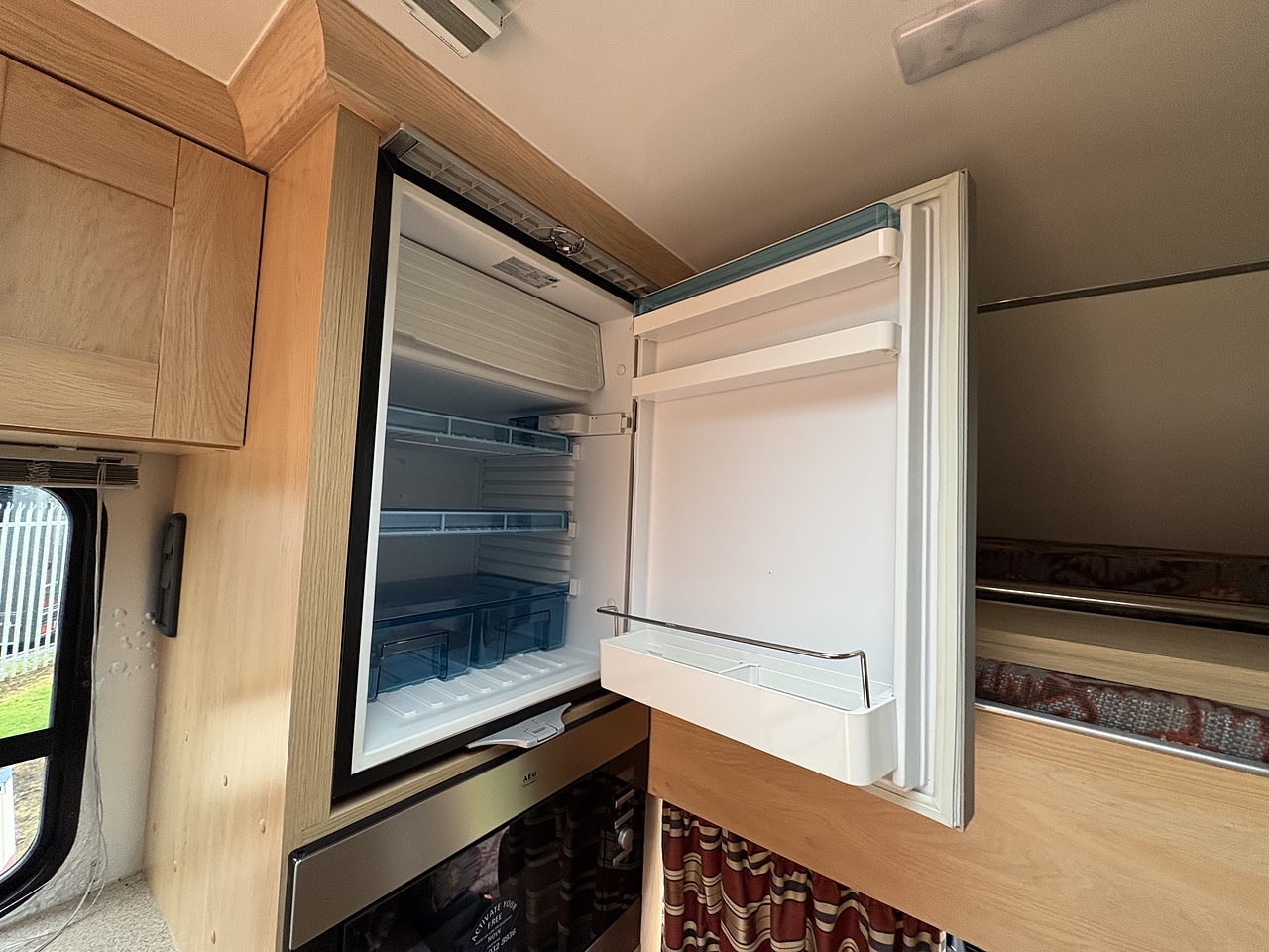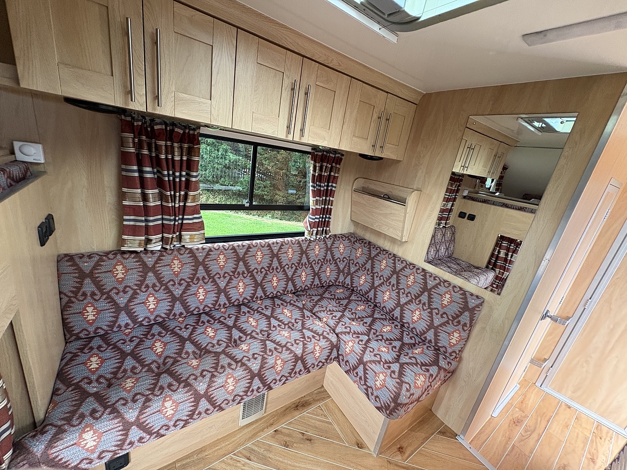 LUXURY LIVING AREA SLEEPING 4, DOUBLE BED IN LUTON, POP UP GLASS ROOF VENT WITH BLIND , DOWNLIGHTERS AND USB CHARGING POINT. "L" SHAPED SOFA WITH PULL DOWN BED UPHOLSTERED IN PATTERNED CLOTH MATCHING THE CAB, REMOVEABLE TABLE, LARGE WARDROBE WITH WAECO FRIDGE ABOVE, SOFT CLOSE HIGH LEVEL STORAGE UNITS IN OAK WITH OAK WALLS, SMEV TRIPLE GAS HOB WITH INTERGRAL HOT/COLD WATER BASIN. MICROWAVE, 240V HOOK UP AND MULTIPLE 3 PIN SOCKETS, TV/DVD PLAYER, INTEGRATED CAB/LIVING SOUND SYSTEM. LARGE GLASS POP UP VENT WITH BLIND , PRIVACY GLASS WITH MATCHING CURTAINS/BLINDS. MOOD LIGHTING, HIGH LEVEL LIGHTING, DIESEL BLOWN AIR HEATING AND HOT WATER SYSTEM. DISCRETE SECURITY BOX. CARNDEAN FLOORING. ON BOARD REMOTE START GENERATOR.