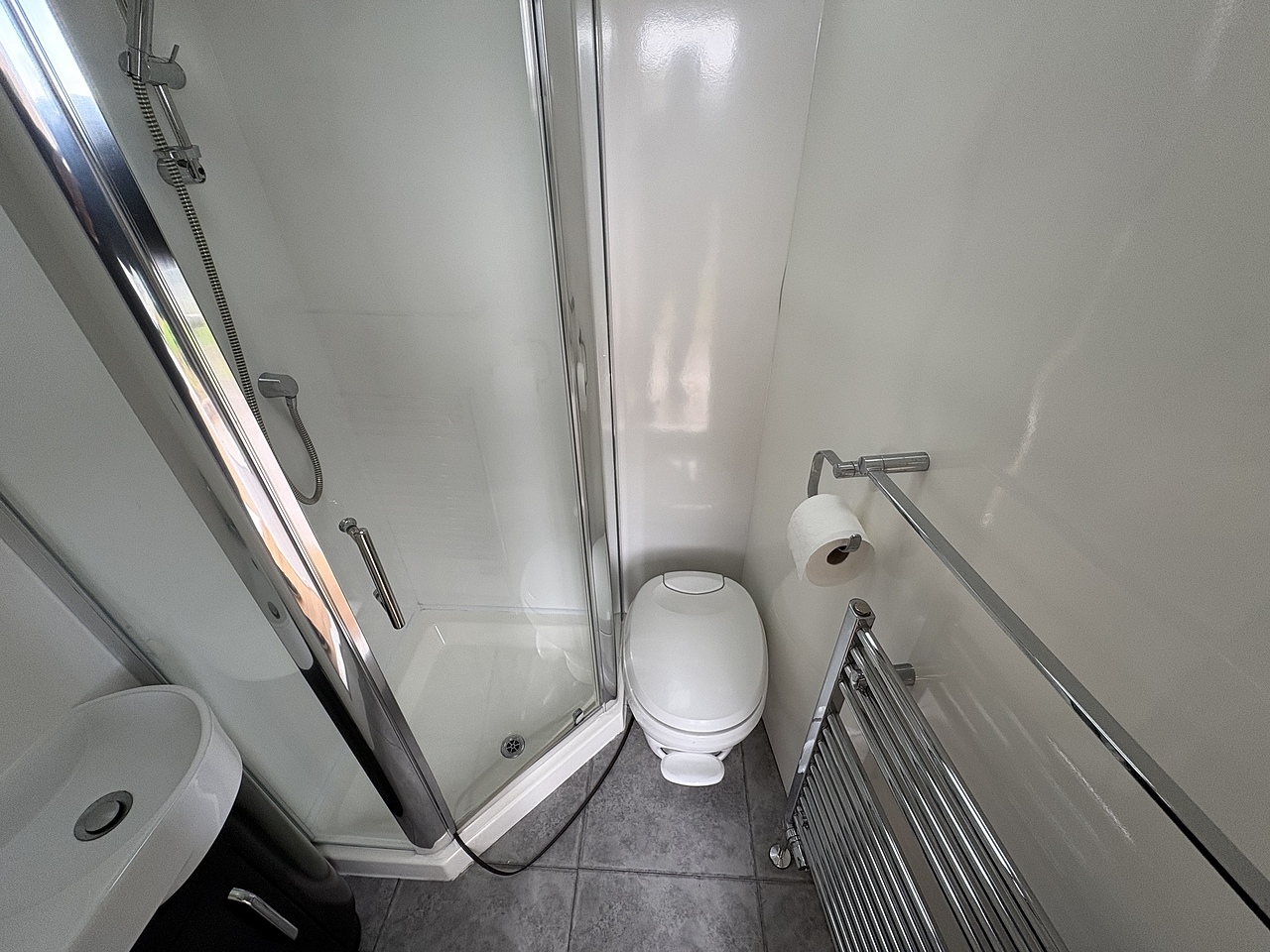 PEDASTAL BASIN WITH HOT AND COLD WATER, SEPARATE SHOWER CUBICLE. HIGH LEVEL VANITY UNIT WITH MIRROR, LARGE POP UP GLASS ROOF VENT, THETFORD CASSETTE TOILET, DOWN LIGHTERS. DOMESTIC HOT WATER RADIATOR.