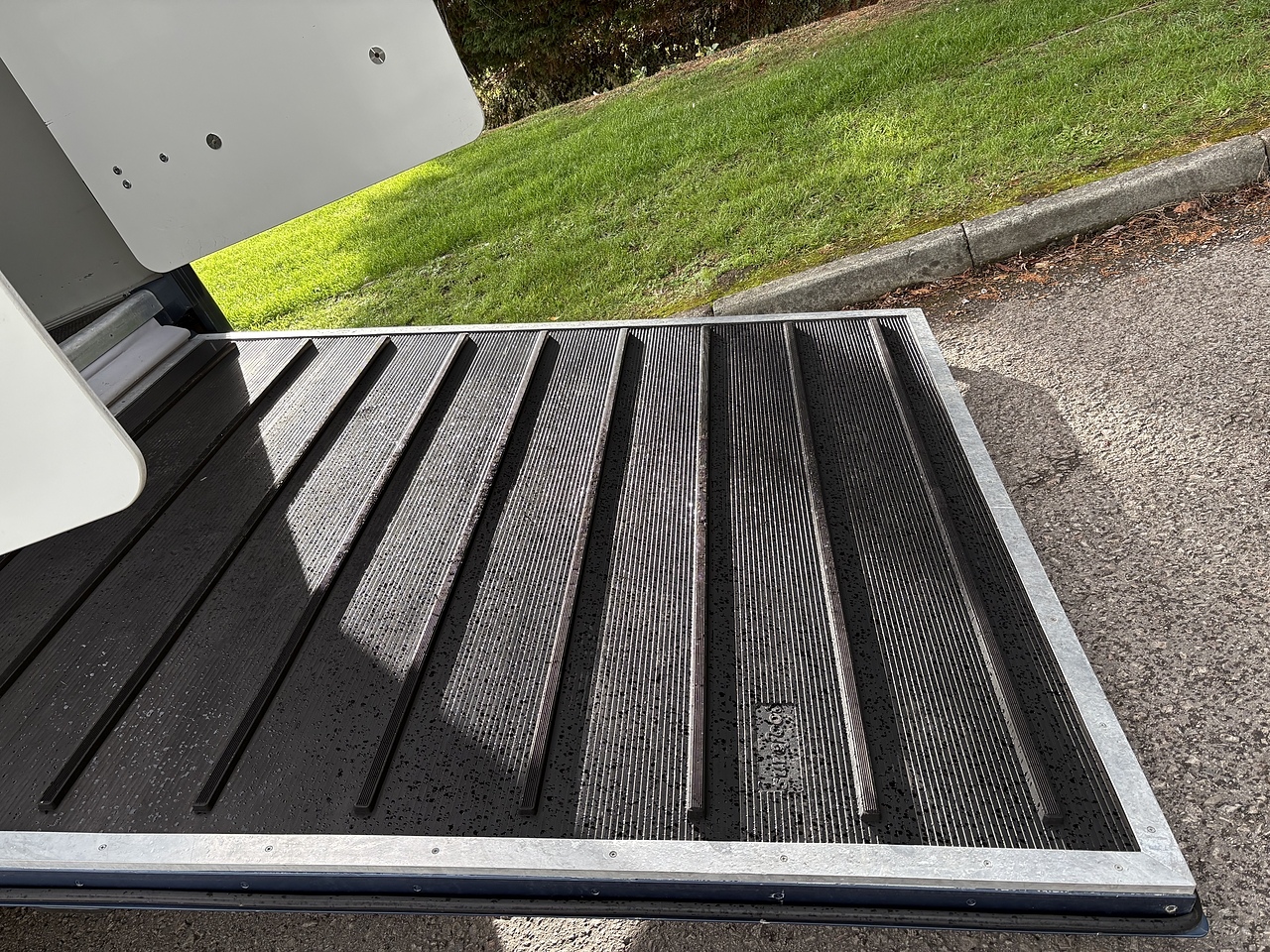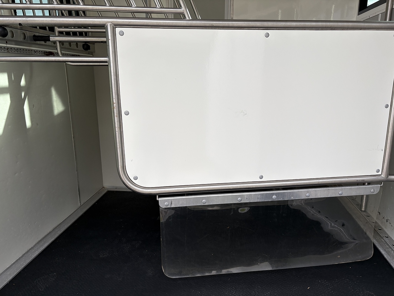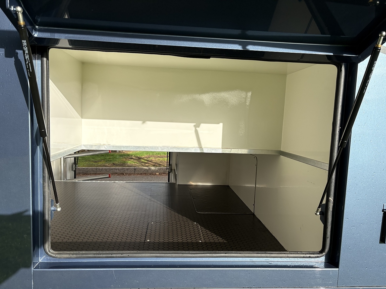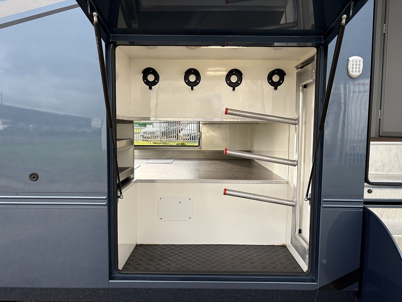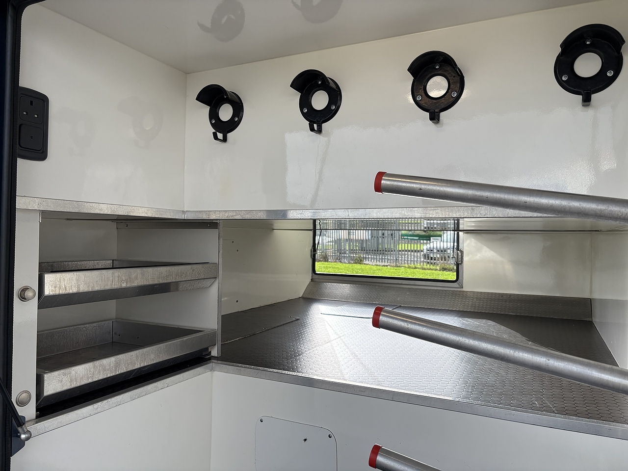 STALLED FOR 2 HORSES/ 3 PONIES, 10MM THICK ONE PIECE RUBBER MAT, ALUMINIUM INTERLOCKING FLOORING SYSTEM WITH ALL ALUMINIUM WASTE TROUGHS TO THE PERIMETER. 2 STAINLESS STEEL GAS SPRUNG PARTITIONS, STAINLESS STEEL HIGH LEVEL RUG RACK, HORSE AREA CAMERA, STAINLESS STEEL WINDOW GRILLS, SPRING BALANCED MANUALLY OPERATED RAMP, DAY AND NIGHT TIME TRAVELLING LIGHTS, REAR LOADING LIGHT, POP UP GLASS ROOF VENT. GRP WALK UP GATES.