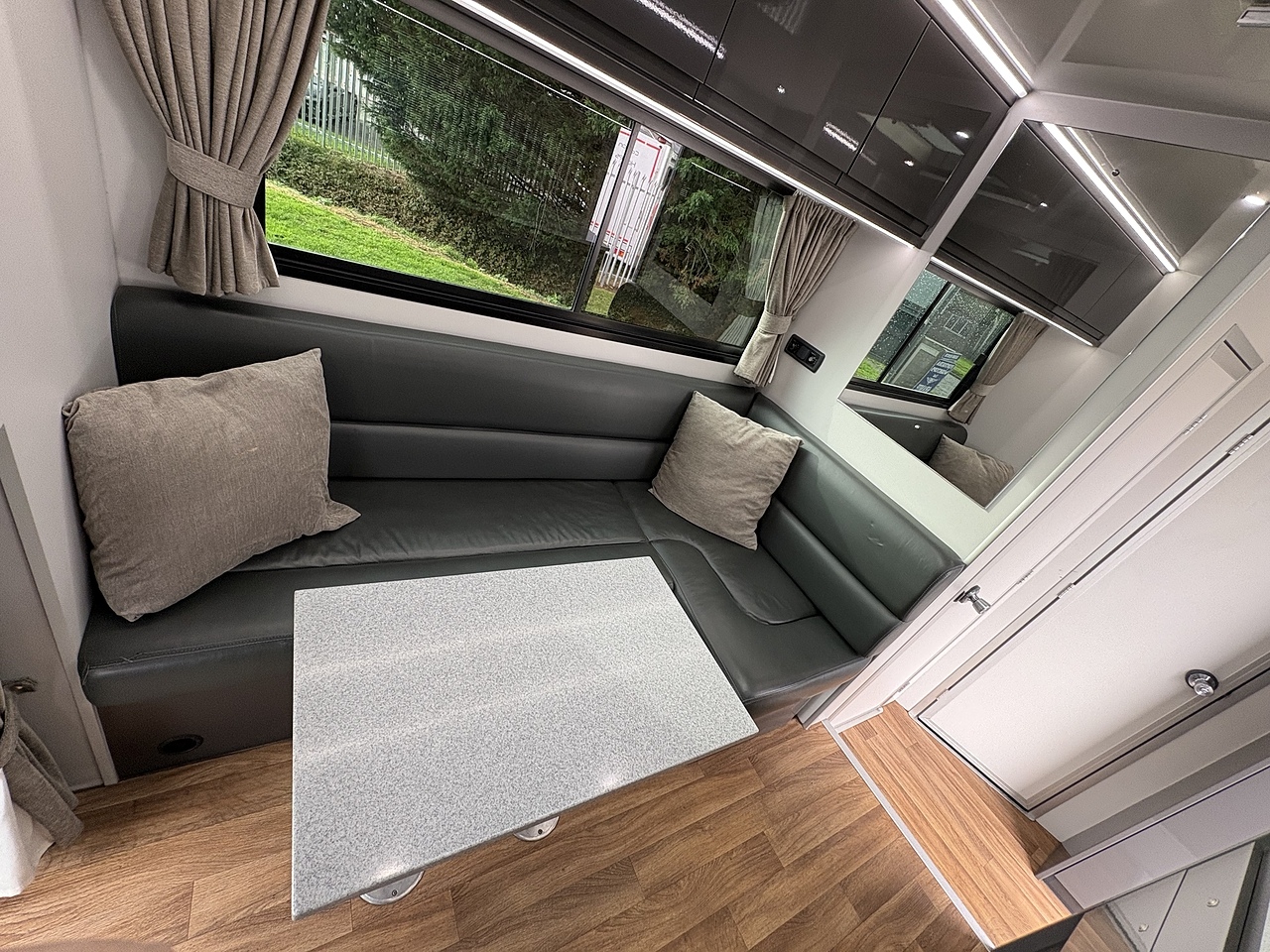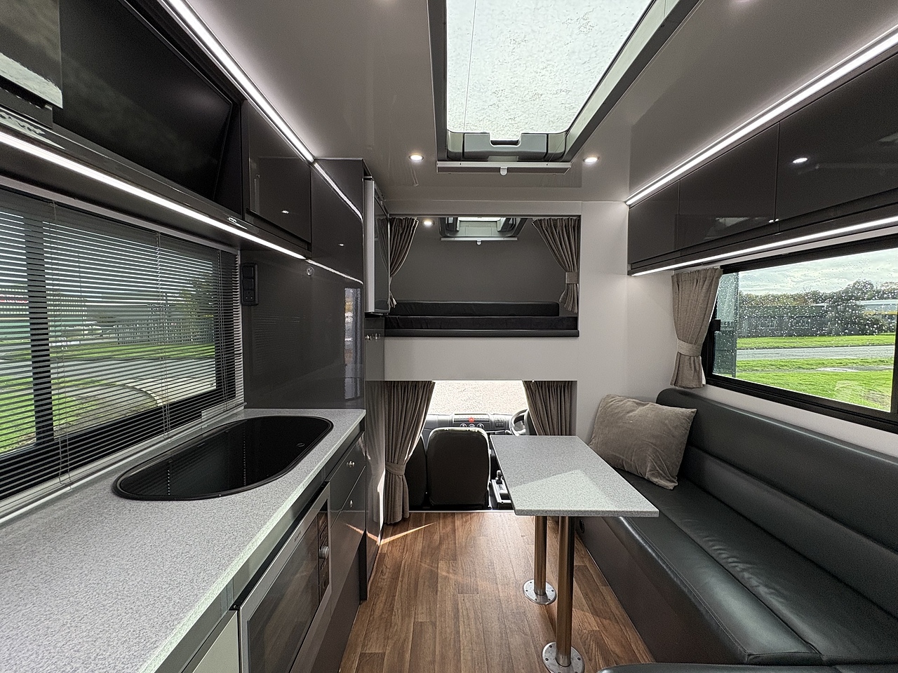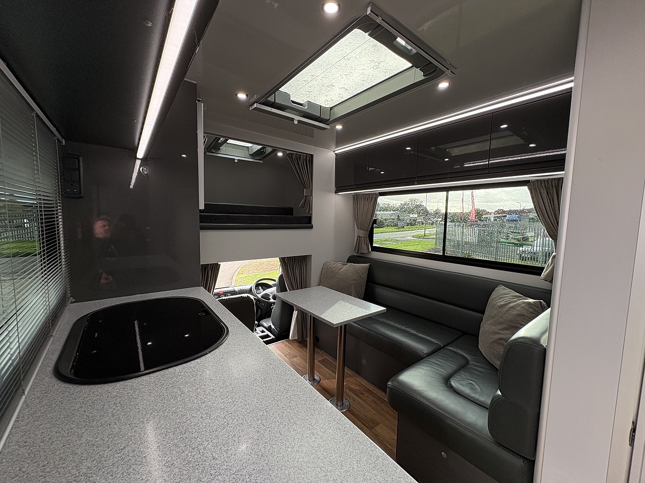 LUXURY LIVING AREA SLEEPING 4, DOUBLE BED IN LUTON, POP UP GLASS ROOF VENT WITH BLIND , DOWNLIGHTERS AND USB CHARGING POINT. "L" SHAPED SOFA WITH PULL DOWN BED UPHOLSTERED CHARCOAL GREY LEATHER MATCHING THE CAB, REMOVEABLE TABLE, LARGE WARDROBE WITH WAECO FRIDGE ABOVE, SOFT CLOSE HIGH LEVEL STORAGE UNITS IN GLOSS PALE GREY WITH PALE GREY WALLS, SMEV TRIPLE GAS HOB WITH INTERGRAL HOT/COLD WATER BASIN. MICROWAVE, 240V HOOK UP AND MULTIPLE 3 PIN SOCKETS, TV/DVD PLAYER, INTEGRATED CAB/LIVING SOUND SYSTEM. LARGE GLASS POP UP VENT WITH BLIND , PRIVACY GLASS WITH MATCHING CURTAINS/BLINDS. MOOD LIGHTING, HIGH LEVEL LIGHTING, TRUMA GAS BLOWN AIR HEATING AND HOT WATER SYSTEM. DISCRETE SECURITY BOX. CARNDEAN FLOORING.