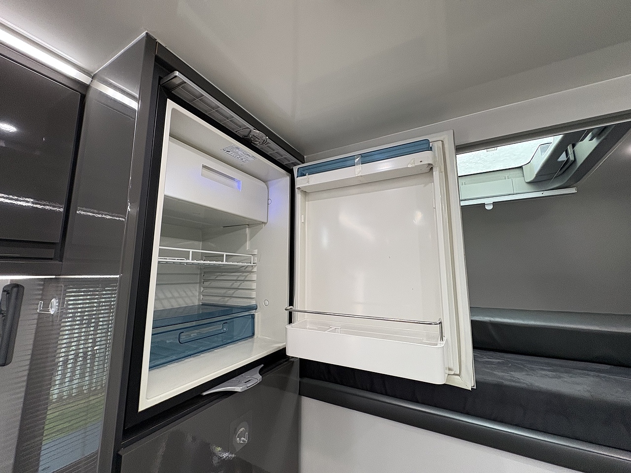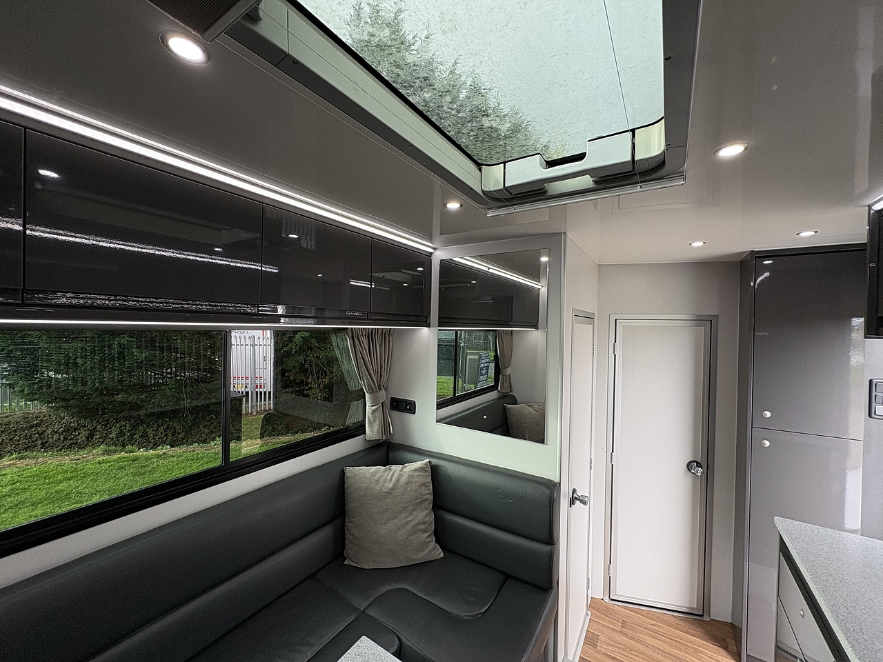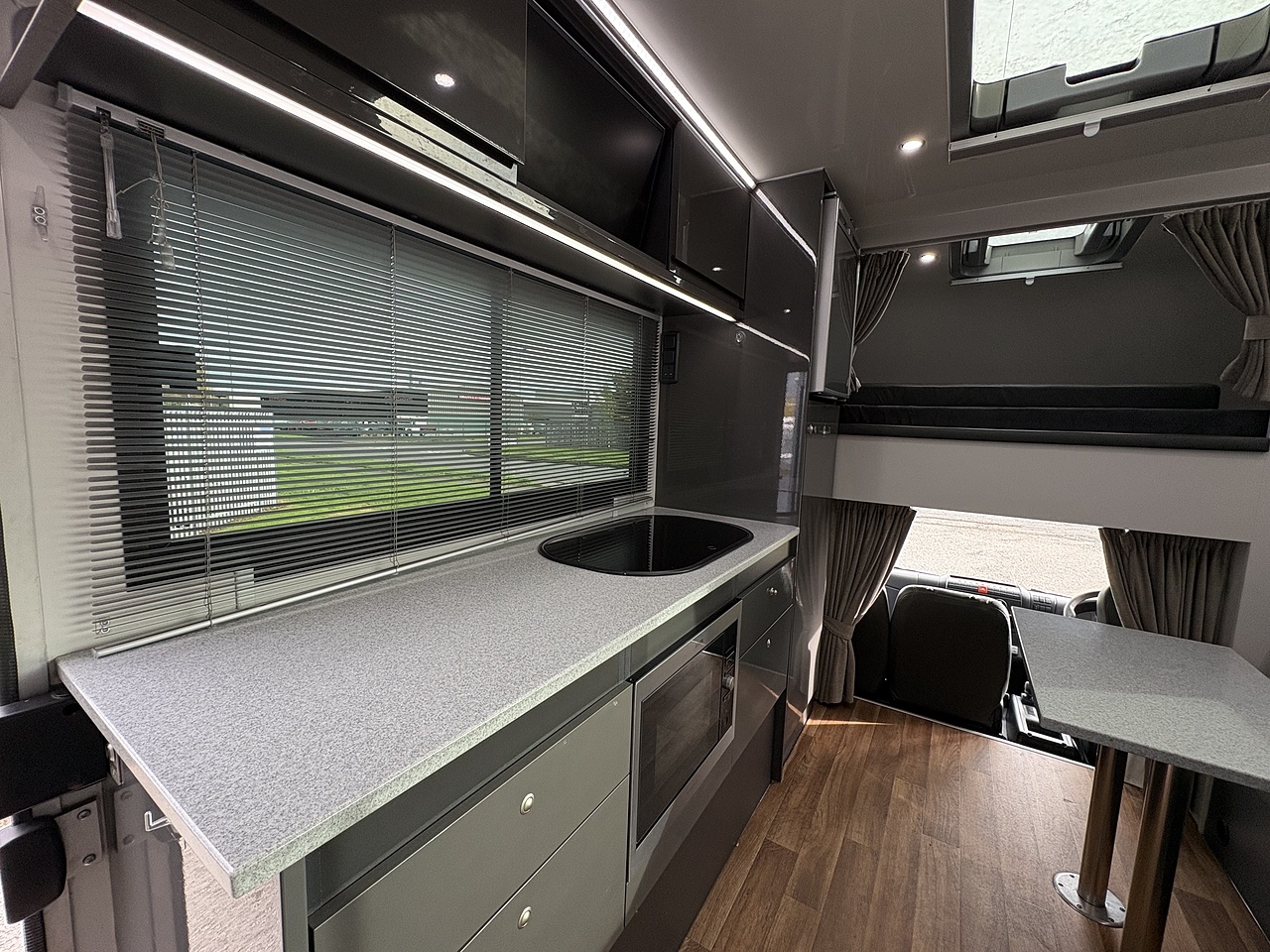 LUXURY LIVING AREA SLEEPING 4, DOUBLE BED IN LUTON, POP UP GLASS ROOF VENT WITH BLIND , DOWNLIGHTERS AND USB CHARGING POINT. "L" SHAPED SOFA WITH PULL DOWN BED UPHOLSTERED CHARCOAL GREY LEATHER MATCHING THE CAB, REMOVEABLE TABLE, LARGE WARDROBE WITH WAECO FRIDGE ABOVE, SOFT CLOSE HIGH LEVEL STORAGE UNITS IN GLOSS PALE GREY WITH PALE GREY WALLS, SMEV TRIPLE GAS HOB WITH INTERGRAL HOT/COLD WATER BASIN. MICROWAVE, 240V HOOK UP AND MULTIPLE 3 PIN SOCKETS, TV/DVD PLAYER, INTEGRATED CAB/LIVING SOUND SYSTEM. LARGE GLASS POP UP VENT WITH BLIND , PRIVACY GLASS WITH MATCHING CURTAINS/BLINDS. MOOD LIGHTING, HIGH LEVEL LIGHTING, TRUMA GAS BLOWN AIR HEATING AND HOT WATER SYSTEM. DISCRETE SECURITY BOX. CARNDEAN FLOORING.