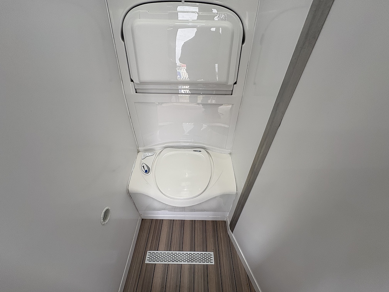 PULL DOWN BASIN WITH HOT AND COLD WATER, RETRACTABLE SHOWER HEAD. HIGH LEVEL VANITY UNIT WITH MIRROR, LARGE POP UP GLASS ROOF VENT, THETFORD CASSETTE TOILET, DOWN LIGHTERS.